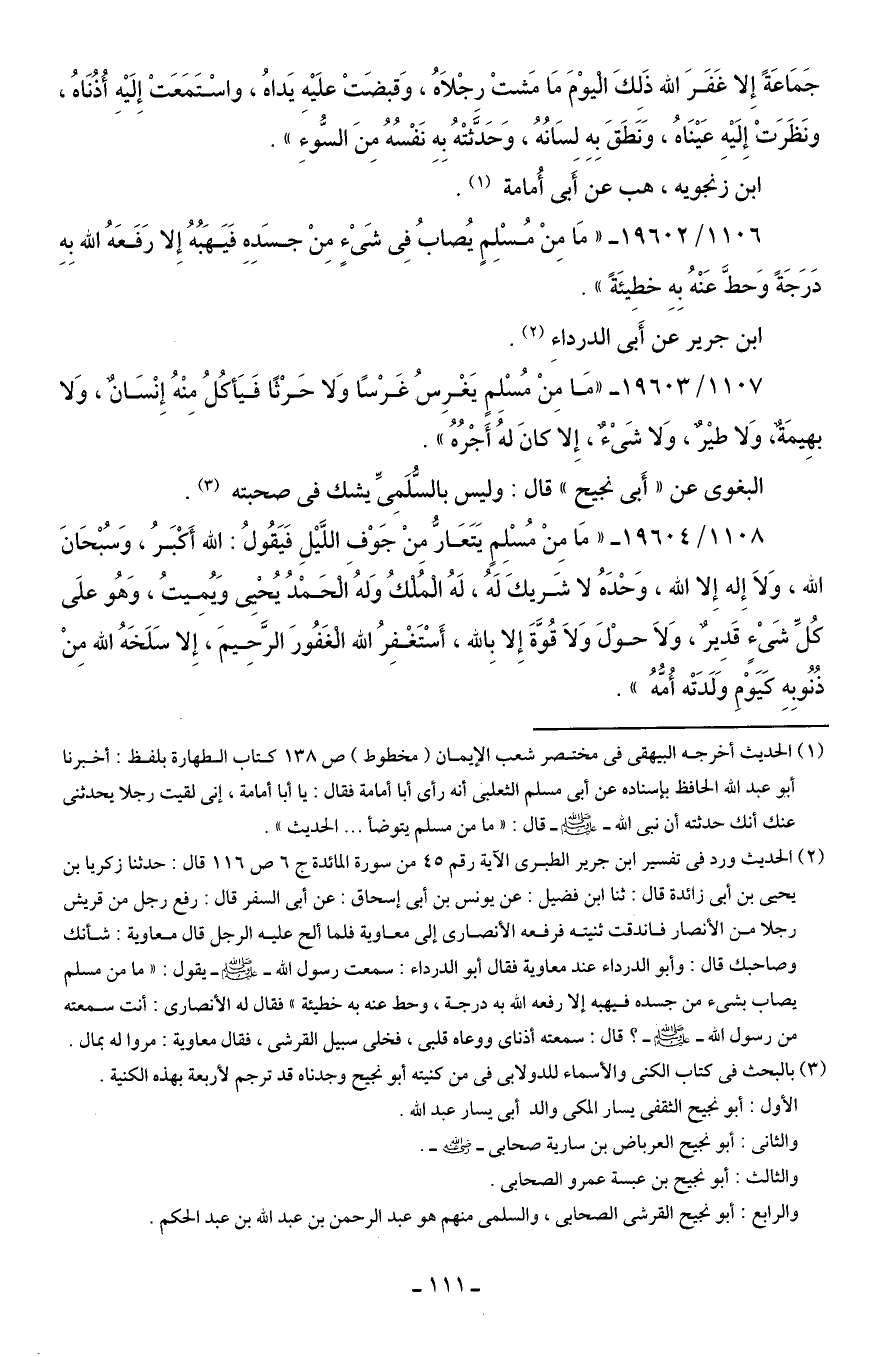 (¬1) الحديث أخرجه البيهقي في مختصر شعب الإيمان (مخطوط) ص 138 كتاب الطهارة بلفظ: أخبرنا أبو عبد الله الحافظ بإسناده عن أبي مسلم الثعلبي أنه رأى أبا أمامة فقال: يا أبا أمامة، إني لقيت رجلا يحدثنى عنك أنك حدثته أن نبي الله - صلى الله عليه وسلم - قال: "ما من مسلم يتوضأ ... الحديث".