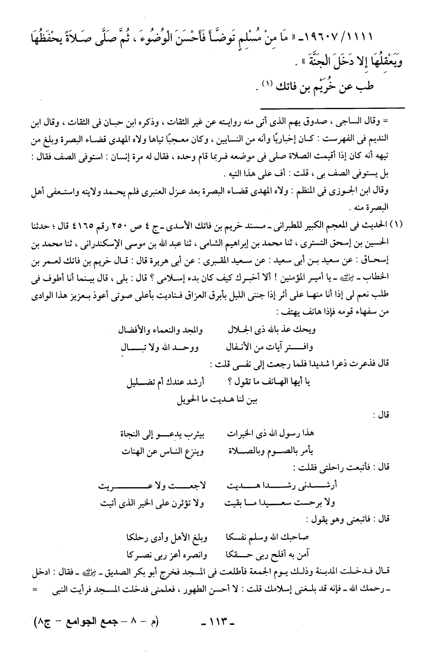 (¬1) الحديث في المعجم الكبير للطبرانى- مسند خريم بن فاتك الأسدى- ج 4 ص 250 رقم 4165 قال؛ حدثنا الحسين بن إسحاق التسترى، ثنا محمد لن إبراهيم الشامي، ثنا عبد الله بن موسى الإسكندرانى، ثنا محمد بن إسحاق: عن سعيد بن أبي سعيد: عن سعيد المقبرى: عن أبي هريرة قال: قال خريم بن فاتك لعمر بن الخطاب - رضي الله عنه - يا أمير المؤمنين! ألا أخبرك كيف كان بدء إسلامي؟ قال: بلى، قال بينما أنا أطوف في طلب نعم لي إذا أنا منها على أثر إذا جننى الليل بأبرق العزاق فناديت بأعلى صوتى أعوذ بعزيز هذا الوادي من سفهاء قومه فإذا هاتف يهتف: