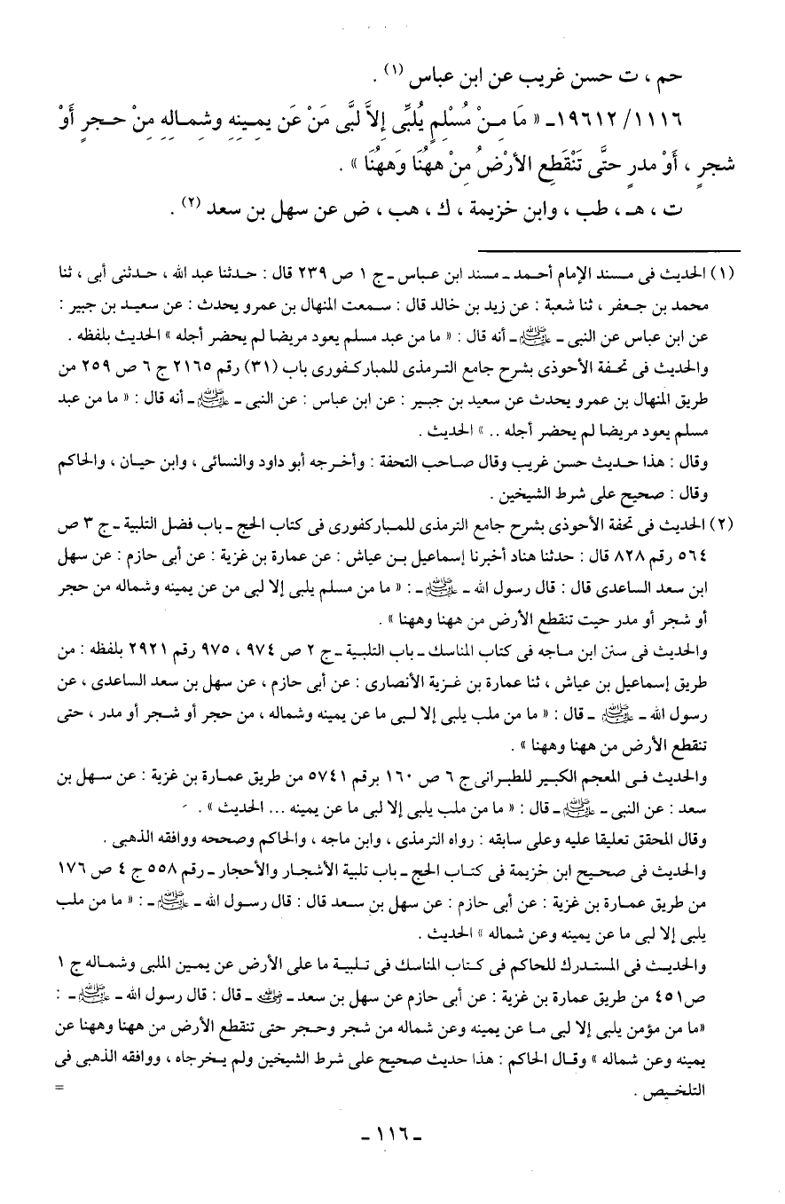 (¬1) الحديث في مسند الإمام أحمد- مسند ابن عباس- ج 1 ص 239 قال: حدثنا عبد الله، حدثني أبي، ثنا محمد بن جعفر، ثنا شعبة: عن زيد بن خالد قال. سمعت المنهال بن عمرو يحدث: عن سعيد بن جبير: عن ابن عباس عن النبي - صلى الله عليه وسلم - أنه قال: "ما من عبد مسلم يعود مريضا لم يحضر أجله" الحديث بلفظه. والحديث في تحفة الأحوذي بشرح جامع الترمذي للمباركفورى باب (31) رقم 2165 ج 6 ص 259 من طريق المنهال بن عمرو يحدث عن سعيد بن جبير: عن ابن عباس: عن النبي - صلى الله عليه وسلم - أنه قال: "ما من عبد مسلم يعود مريضا لم يحضر أجله .. " الحديث.