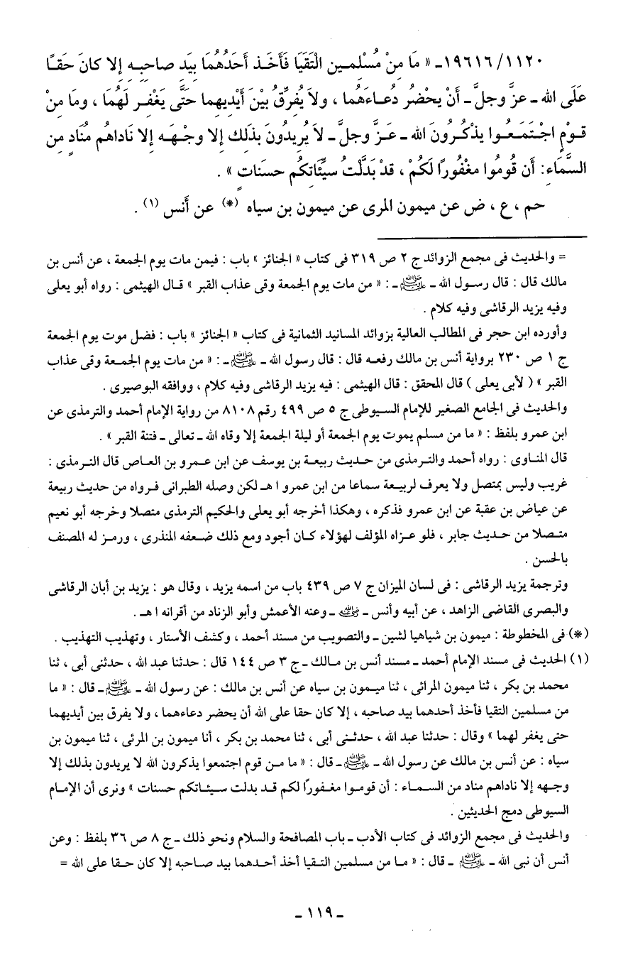 1120/ 19616 - "مَا مِنْ مُسْلِمين التَقَيَا فَأَخَذ أَحَدُهُمَا بِيَد صاحِبِهِ إِلا كانَ حَقًّا عَلَى الله - عزَّ وجلَّ - أَنْ يحْضُر دُعاءَهُما، ولا يُفِرِّقُ بينَ أَيدِيهِما حَتَّى يَغْفِر لَهُمَا، ومَا مِنْ قوْمٍ اجْتَمَعُوا يذْكُرُونَ الله- عَزَّ وجلَّ - لَا يُرِيدُونَ بذَلِك إِلا وجْهَه إِلا نَاداهُم مُنَادٍ مِن السَّمَاءِ: أَن قُومُوا مغْفُورًا لَكُمْ، قدْ بَدَّلْتُ سيِّئَاتِكُم حسَنات".