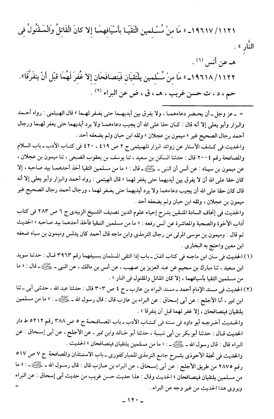 1121/ 19617 - "مَا مِنْ مُسْلِمين الْتَقَيَا بأَسْيَافِهمَا إِلا كانَ الْقَاتِلُ وَالْمَقْتُولُ في النَّار".