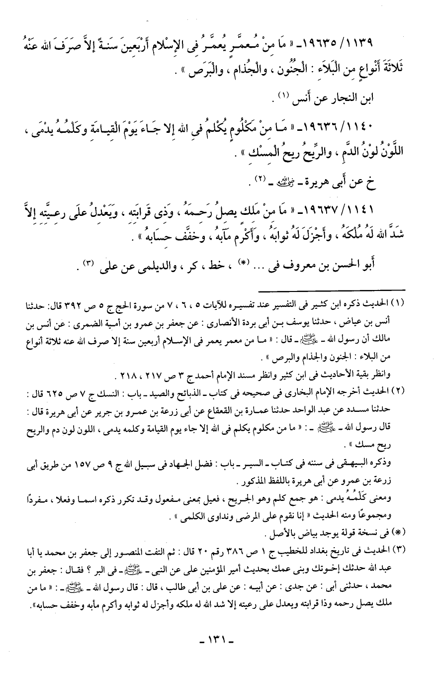 1140/ 19636 - "مَا مِنْ مَكْلُومٍ يُكْلمُ في الله إِلا جَاءَ يَوْمَ القِيامَةِ وكَلْمُهُ يدْمَى، اللَّوْنُ لوْنُ الدَّمِ، والرِّيحُ ريحُ المِسْكِ".
