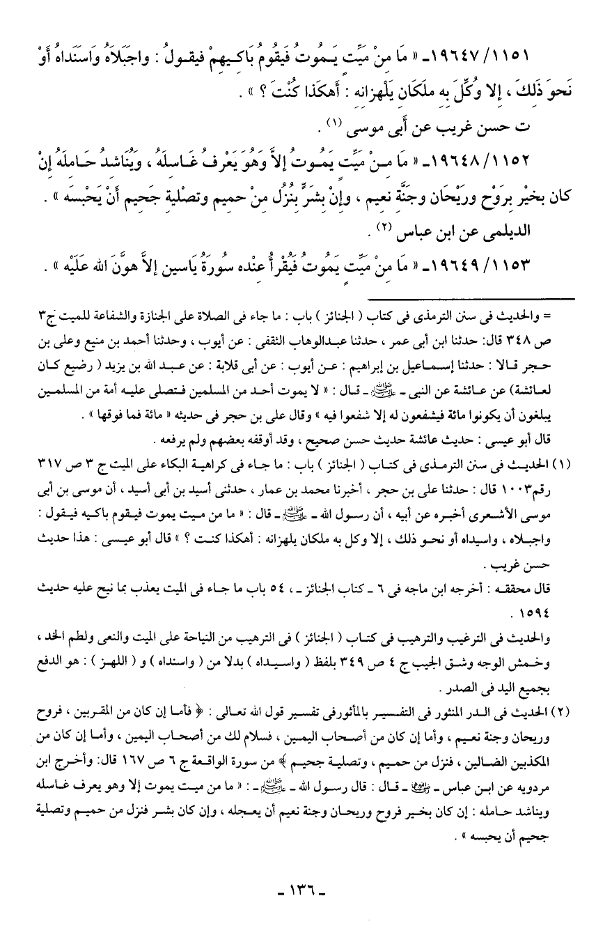 1153/ 19649 - "مَا مِنْ مَيِّتٍ يَمُوتُ فَيُقْرأُ عِنْده سُورَةُ يَاسين إلَّا هوَّنَ الله عَلَيه".