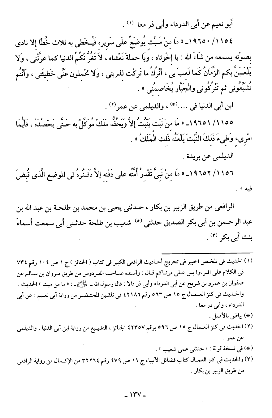 1154/ 19650 - "مَا مِنْ مَيِّتٍ يُوضَعُ علَى سَرِيرهِ فَيُخْطى به ثلاث خُطًا إِلا نادى بِصوْته يسمعه من شَاءَ الله: يا إِخْوتاه، ويَا حملةَ نَعْشاه، لَا تَغُرَّنَكُمُ الدنيا كما غرَّتْنى، وَلا يَلْعَبَنَّ بكم الزَّمَانُ كَما لَعِبَ بى، أَتْرُكُ ما تَركْت لِذريتى، وَلا تحْمِلون عَنِّي خَطِيئَتى، وَأَنْتُم تُشَيِّعُونى ثم تَتْرُكُونى والْجَبَّار يُخَاصِمُنِى".