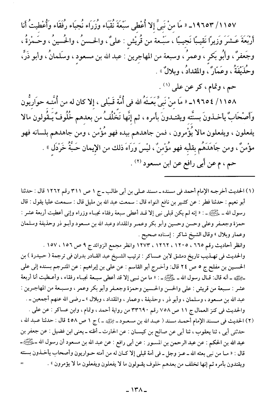 1157/ 19653 - "مَا مِنْ نَبِيٍّ إِلا أُعْطِي سَبْعَةَ نُقَبَاء وُزَرَاء نُجبَاء رُفَقَاء وَأُعْطِيتُ أَنا أَرْبَعَةَ عَشَرَ وَزيرًا نَقِيبًا نَجِيبًا، سَبْعة من قُريشٍ. عليٌّ، والحسنُ، والحُسينُ، وحَمْزةُ، وجَعفرٌ، وأَبُو بَكرٍ، وعمرُ، وسبعة من المهاجِرين. عبد الله بن مسعودٍ، وسَلمانُ، وأبو ذَرٍّ، وحُذَيفَةُ، وعَمّارٌ، والمقدادُ، وبلالٌ".