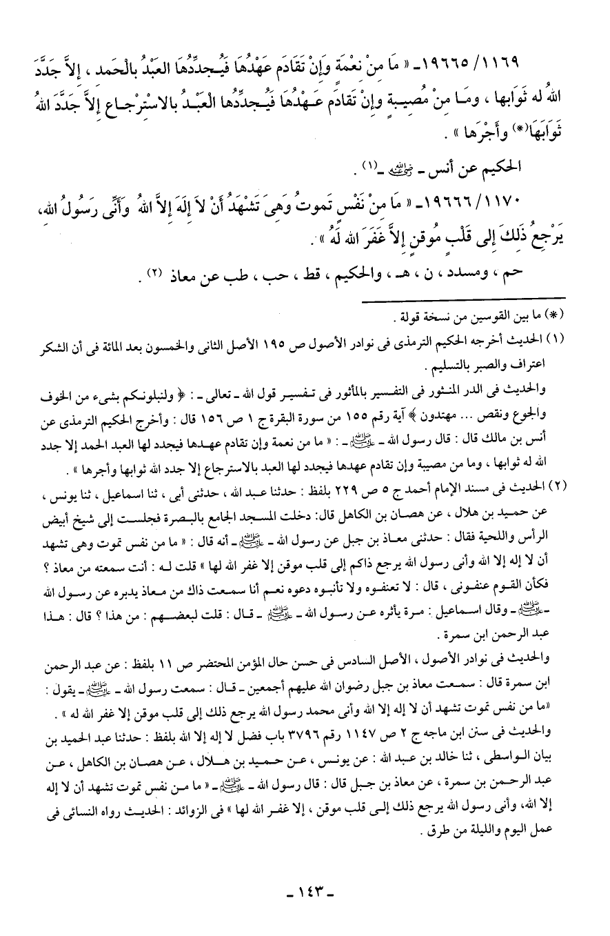 1169/ 19665 - "مَا مِنْ نِعْمَةٍ وَإِنْ تَقَادَم عَهْدُهَا فَيُجدِّدُهَا العَبْدُ بالْحَمدِ، إلَّا جَدَّدَ اللهُ له ثَوَابها، ومَا مِنْ مُصِيبةٍ وإِنْ تَقادَم عَهْدُهَا فَيُجدِّدُها الْعَبْدُ بالاسْتِرْجاع إلَّا جَدَّدَ اللهُ ثَوَابَهَا (*) وأَجْرَها".