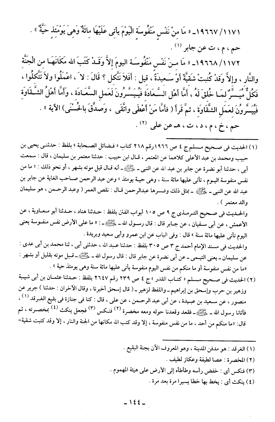 (¬2) الحديث في صحيح مسلم"كتاب القدر" ج 4 ص 239 رقم 2647 بلفظ: حدثنا عثمان بن أبي شيبة وزهير بن حرب وإسحق بن إبراهيم -واللفظ لزهير- (قال إسحاق أخبرنا، وقال الآخران: حدثنا) جرير عن منصور، عن سعيد بن عبيدة، عن أبي عبد الرحمن، عن علي، قال: كنا في جنازة في بقيع الغرقد (أ)، فأتانا رسول الله - صلى الله عليه وسلم - فقعد وقعدنا حوله ومعه مخصرة (ب) فنكس (ج) فجعل ينكث (د) بمخصرته، ثم قال: "ما منكم من أحد، ما من نفس منفوسة، إلا وقد كتب الله مكانها من الجنة والنار، إلا وقد كتبت شقية =