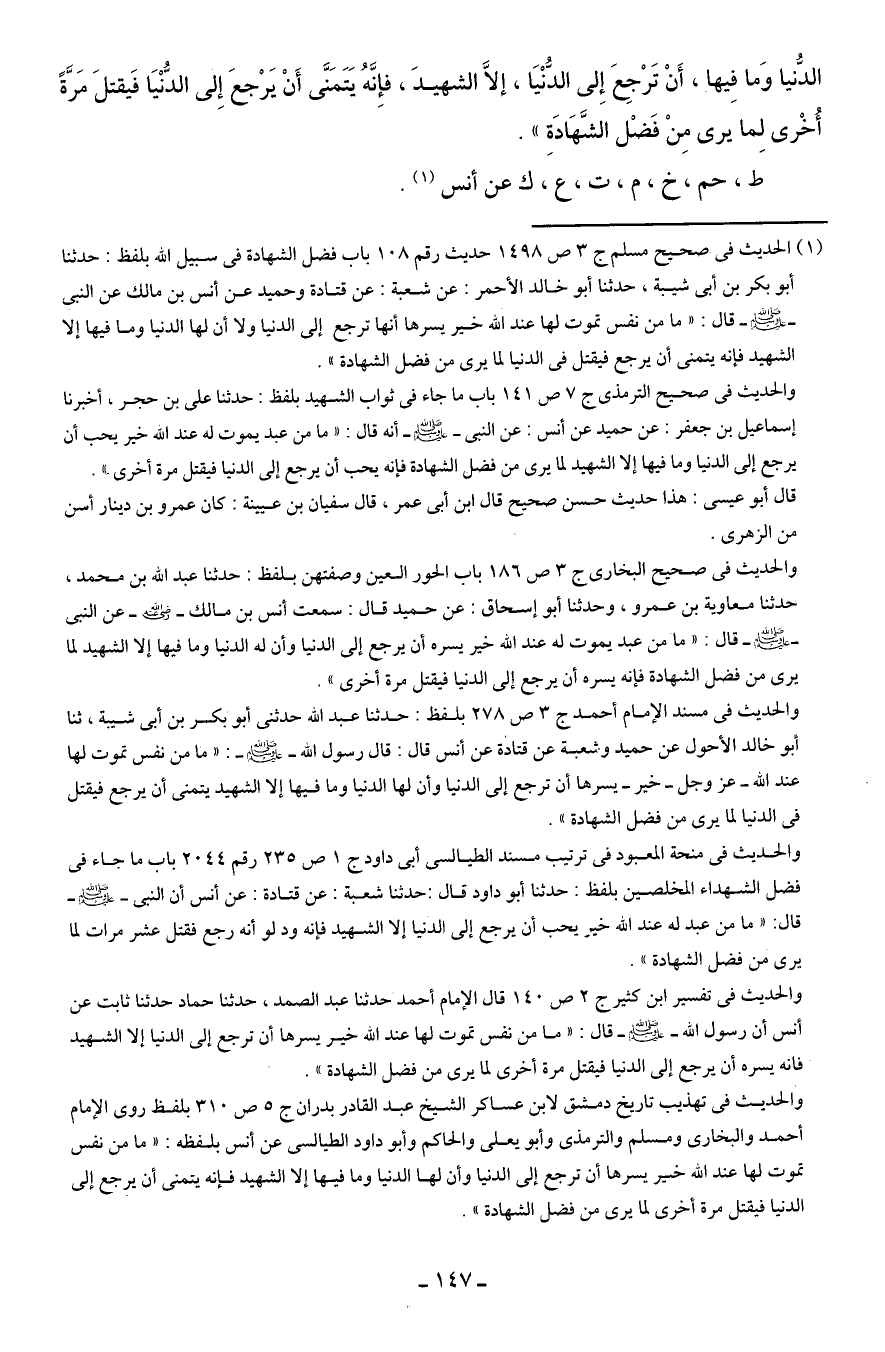 (¬1) الحديث في صحيح مسلم ج 3 ص 1498 حديث رقم 108 باب فضل الشهادة في سبيل الله بلفظ: حدثنا أبو بكر بن أبي شيبة، حدثنا أبو خالد الأحمر: عن شعبة: عن قتادة وحميد عن أنس بن مالك عن النبي - صلى الله عليه وسلم - قال: "ما من نفس تموت لها عند الله خير يسرها أنها ترجع إلى الدنيا ولا أن لها الدنيا وما فيها إلا الشهيد فإنه يتمنى أن يرجع فيقتل في الدنيا لما يرى من فضل الشهادة".