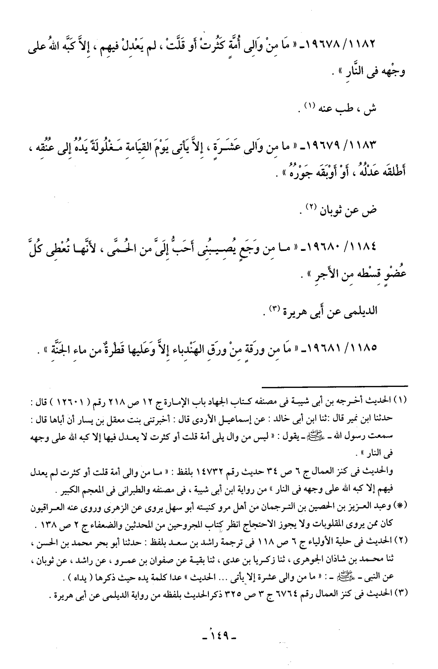 1182/ 19678 - "مَا مِنْ وَالِى أُمَّةٍ كَثُرتْ أَو قَلَّتْ، لم يَعْدِلْ فيهِم، إلَّا كَبَّه اللهُ على وجْهه في النَّارِ".