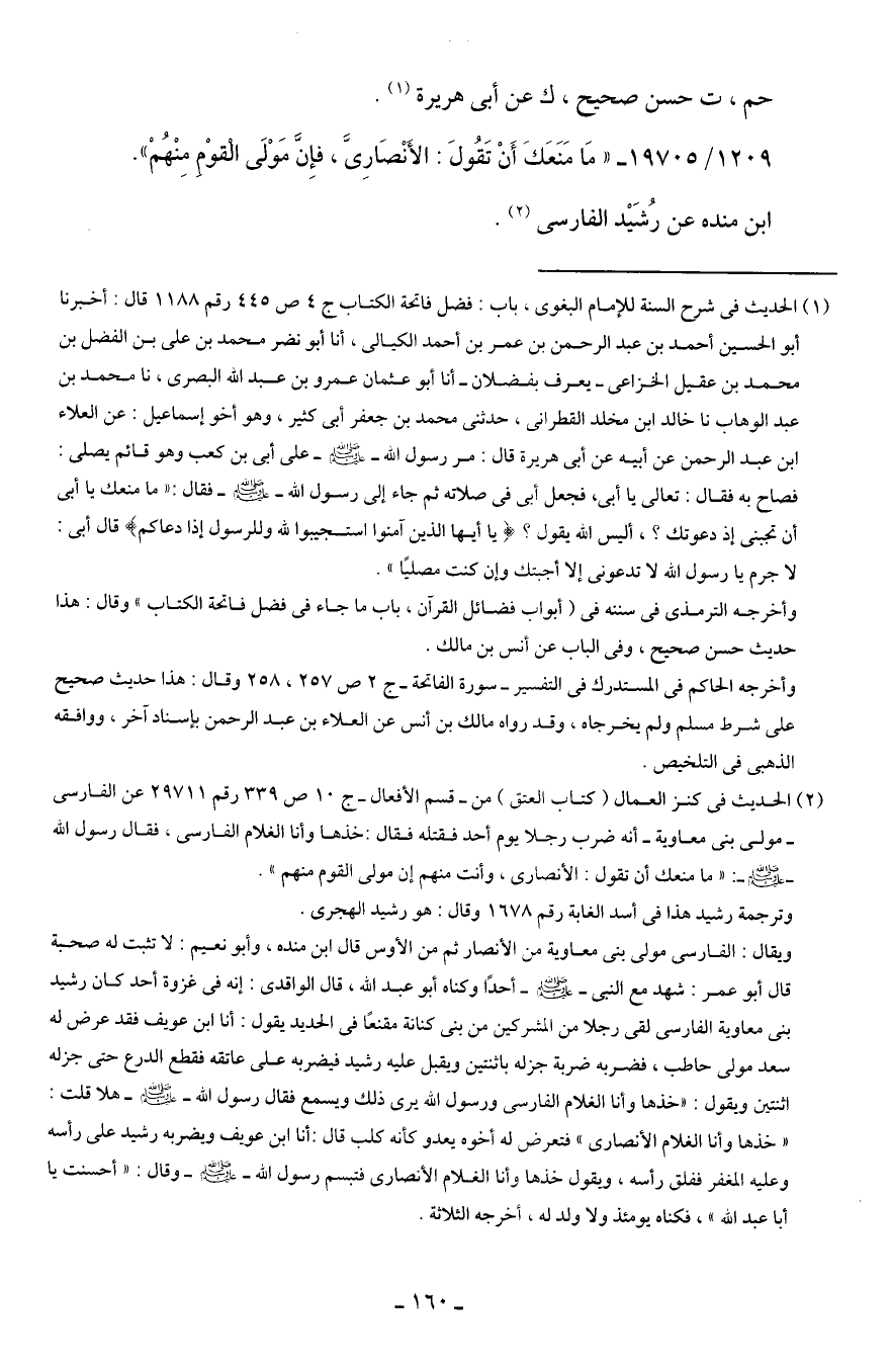 (¬2) الحديث في كنز العمال (كتاب العتق) من-قسم الأفعال- ج 10 ص 339 رقم 29711 عن الفارسى -مولى بنى معاوية- أنه ضرب رجلا يوم أحد فقتله فقال: خذها وأنا الغلام الفارسى، فقال رسول الله - صلى الله عليه وسلم -: "ما منعك أن تقول: الأنصاري، وأنت منهم إن مولى القوم منهم".