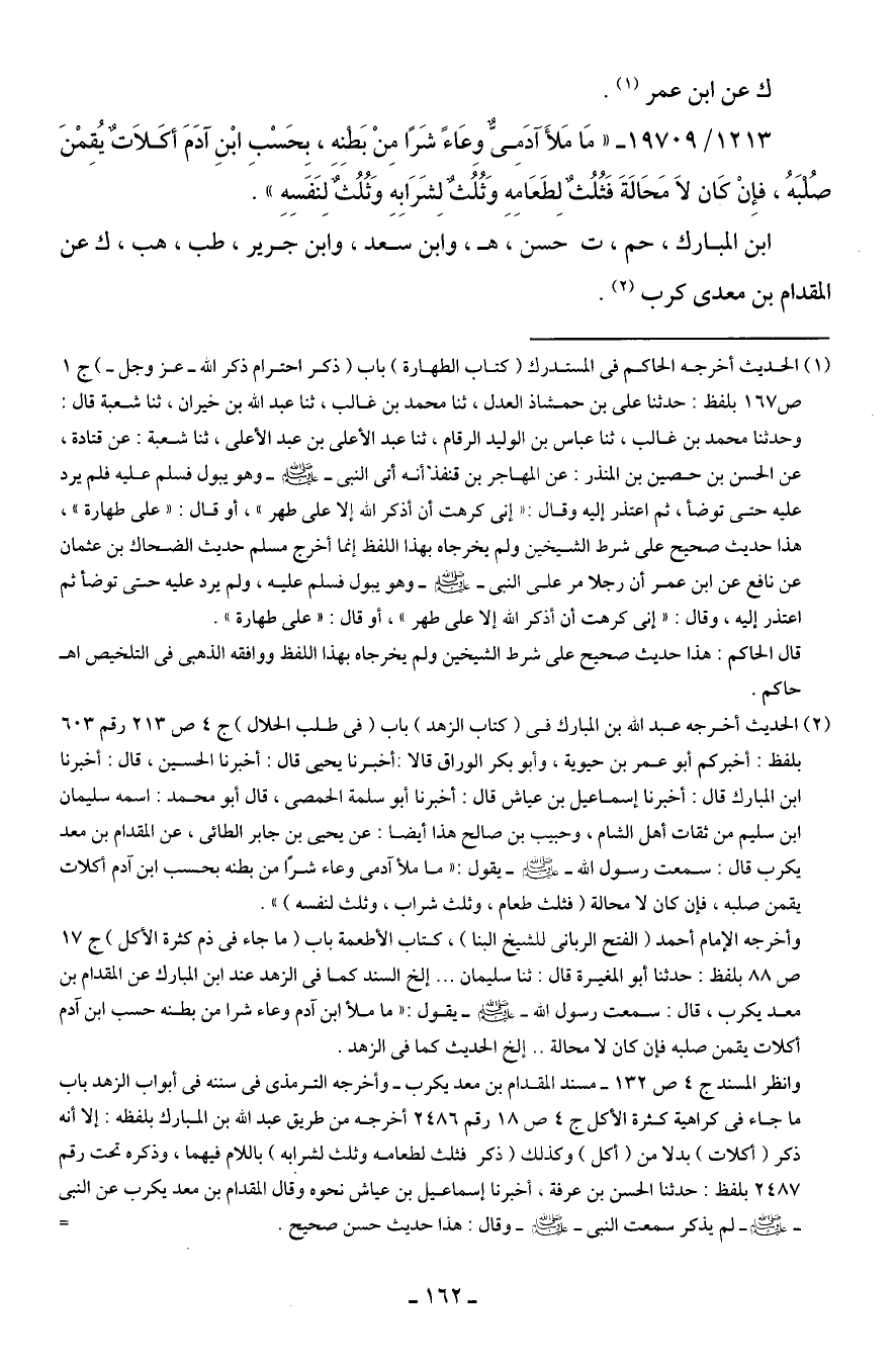 (¬2) الحديث أخرجه عبد الله بن المبارك في (كتاب الزهد) باب (في طلب الحلال) ج 4 ص 213 رقم 603 بلفظ: أخبركم أبو عمر بن حيوية، وأبو بكر الوراق قالا: أخبرنا يحيى قال: أخبرنا الحسين، قال: أخبرنا ابن المبارك قال: أخبرنا إسماعيل بن عياش قال: أخبرنا أبو سلمة الحمصى، قال أبو محمد: اسمه سليمان بن سليم من ثقات أهل الشام، وحبيب بن صالح هذا أيضًا: عن يحيى بن جابر الطائى، عن المقدام بن معد يكرب قال: سمعت رسول الله - صلى الله عليه وسلم - يقول: "ما ملأ آدمى وعاء شرًّا من بطنه بحسب ابن آدم أكلات يقمن صلبه، فإن كان لا محالة (فثلث طعام، وثلث شراب، وثلث لنفسه) ".