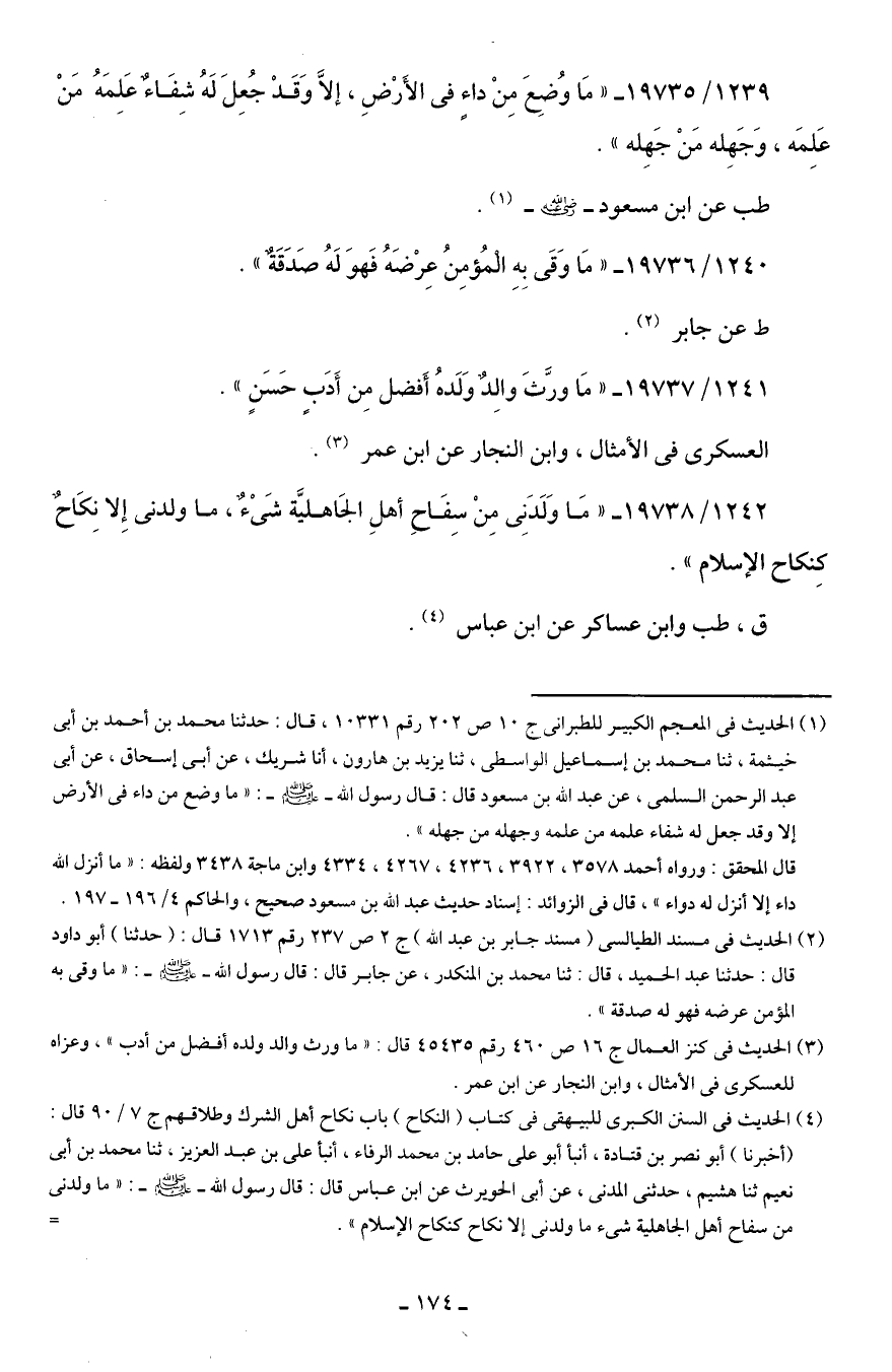 1239/ 19735 - "مَا وُضِعَ مِنْ داءٍ في الأَرْضِ، إلَّا وَقَدْ جُعِلَ لَهُ شِفَاءٌ عَلِمَهُ مَنْ عَلِمَه، وَجَهِله مَنْ جَهِله".