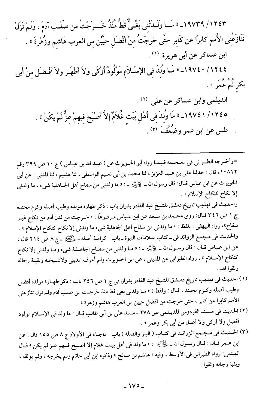 (¬1) الحديث في تهذيب تاريخ دمشق للشيخ عبد القادر بدران في ج 1 ص 246 باب: ذكر طهارة مولده أفضل وطيب أصله وكرم محتد، قال: ولفظ ("ما ولدنى بغى قط منذ خرجت من صلب آدم ولم تزل تنازعنى الأمم كابرا عن كابر، حتى خرجت من أفضل حيين من العرب هاشم وزهرة".