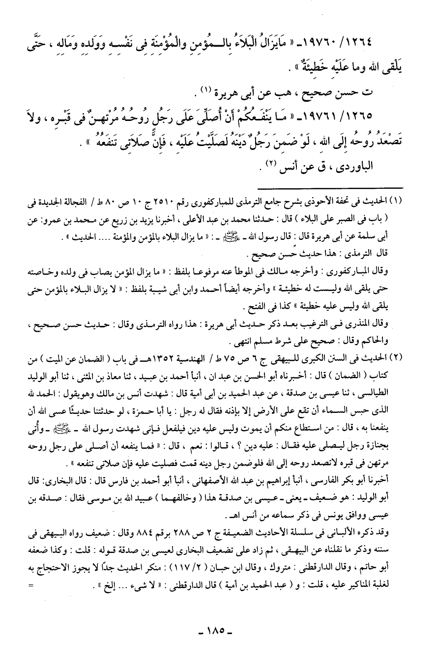 (¬2) الحديث في السنن الكبرى للبيهقى ج 6 ص 75 ط / الهندسية 1352 هـ في باب (الضمان عن الميت) من كتاب (الضمان) قال: أخبرناه أبو الحسن بن عبدان، أنبأ أحمد بن عبيد، ثنا معاذ بن المثنى، ثنا أبو الوليد الطيالسى، ثنا عيسى بن صدقة، عن عبد الحميد بن أبي أمية قال: شهدت أنس بن مالك وهو يقول: الحمد لله الذي حبس السماء أن تقع على الأرض إلا بإذنه فقال له رجل: يا أبا حمزة، لو حدثتنا حديثًا عسى الله أن ينفعنا به، قال: من استطاع منكم أن يموت وليس عليه دين فيلفعل فإني شهدت رسول الله - صلى الله عليه وسلم - وأُتى بجنازة رجل ليصلى عليه فقال: عليه دين؟ ، قالوا: نعم، قال: "فما ينفعه أن أصلى على رجل روحه مرتهن في قبره لا تصعد روحه إلى الله فلو ضمن رجل دينه قمت فصليت عليه فإن صلاتى تنفعه".