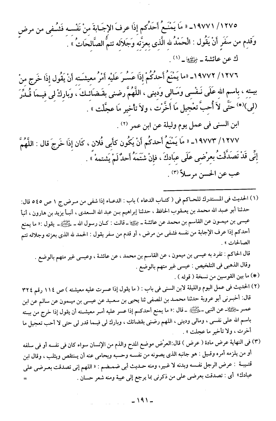1275/ 19771 - "مَا يَمْنَعُ أَحَدُكم إِذَا عرفَ الإِجَابةَ مِنْ نَفْسِهِ فَشُفِي من مرضٍ وَقدِم من سَفَرٍ أَنْ يَقُول: الْحَمْدُ للهِ الَّذِي بِعِزَّتِهِ وَجَلَالِه تتمُّ الصَّالِحَاتُ".