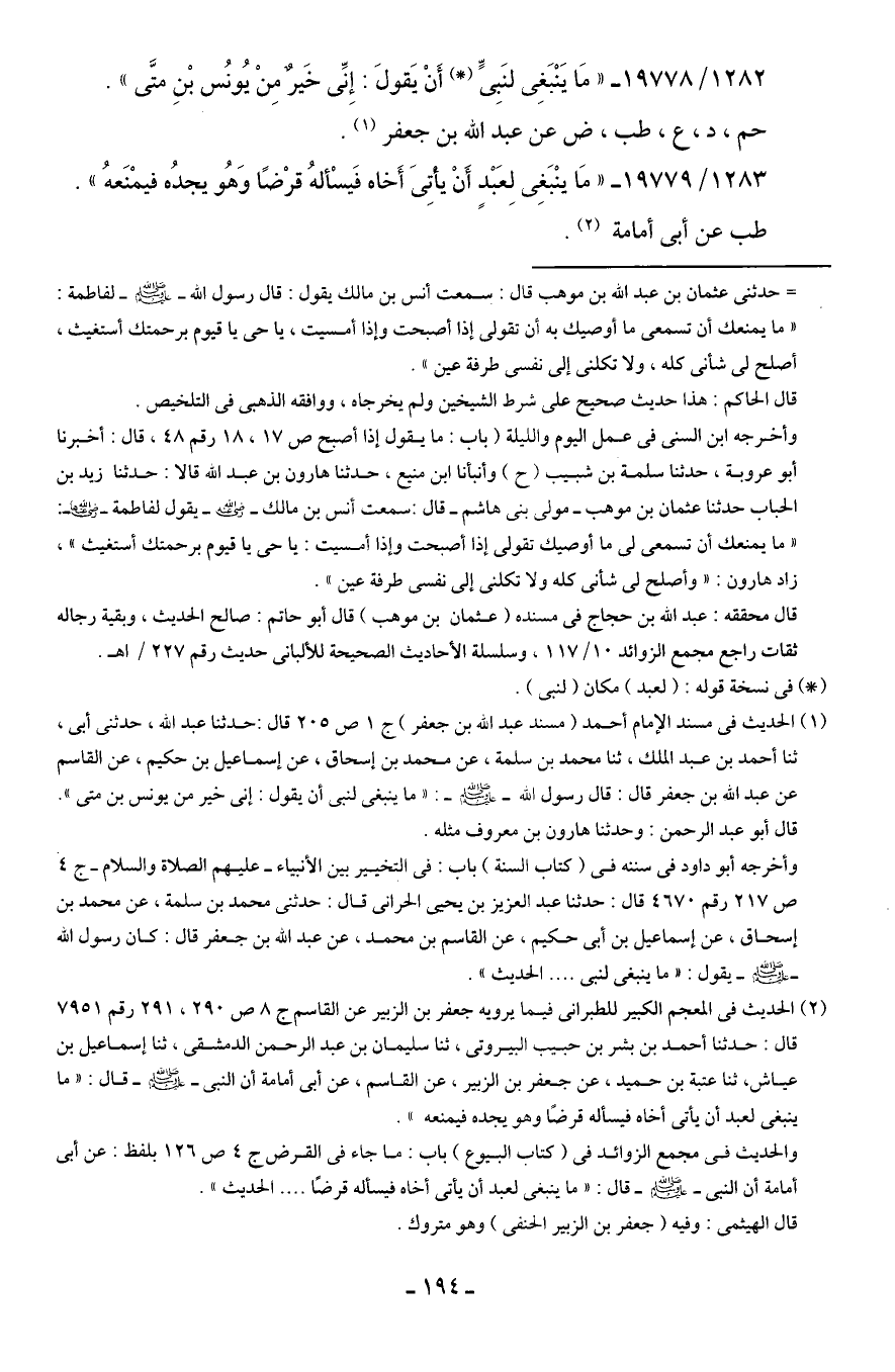 (¬2) الحديث في المعجم الكبير للطبراني فيما يرويه جعفر بن الزبير عن القاسم ج 8 ص 290، 291 رقم 7951 قال: حدثنا أحمد بن بشر بن حبيب البيروتي، ثنا سليمان بن عبد الرحمن الدمشقي، ثنا إسماعيل بن عياش، ثنا عتبة بن حميد، عن جعفر بن الزبير، عن القاسم، عن أبي أمامة أن النبي - صلى الله عليه وسلم - قال: "ما ينبغي لعبد أن يأتي أخاه فيسأله قرضًا وهو يجده فيمنعه".