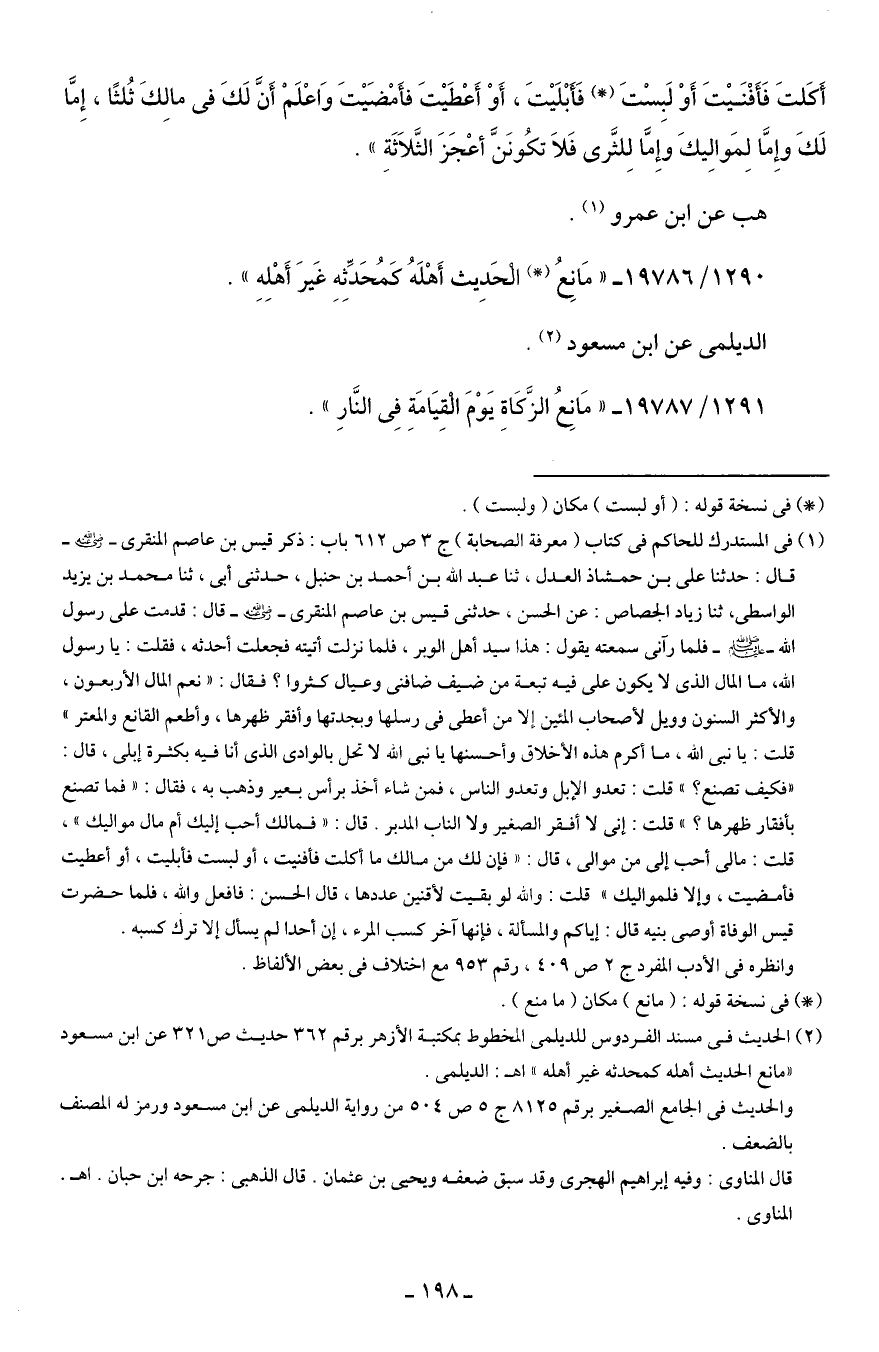 (¬2) الحديث في مسند الفردوس للديلمي المخطوط بمكتبة الأزهر برقم 362 حديث ص 321 عن ابن مسعود "مانع الحديث أهله كمحدثه غير أهله" اهـ: الديلمي.
