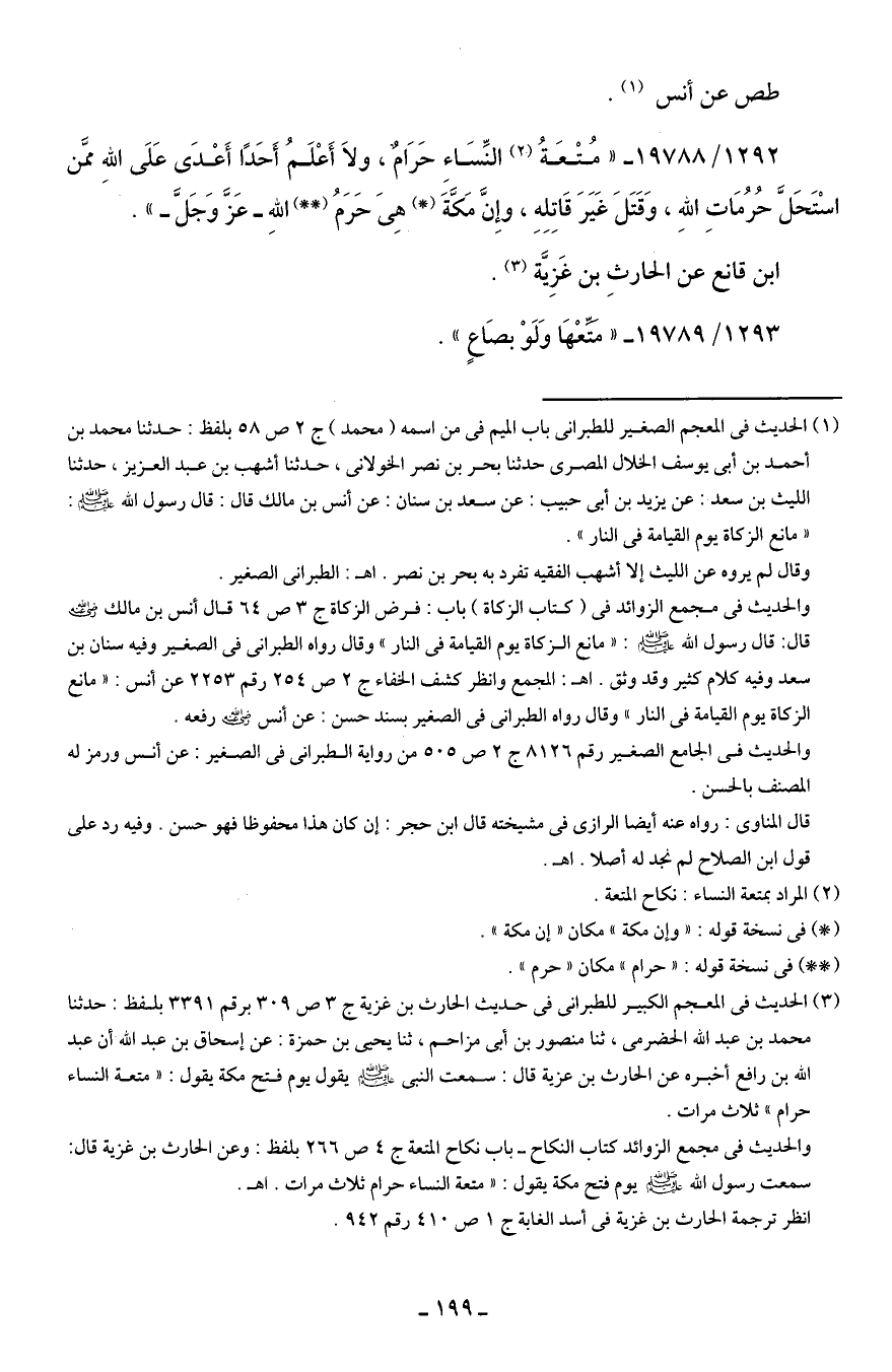 (¬3) الحديث في المعجم الكبير للطبراني في حديث الحارث بن غزية ج 3 ص 309 برقم 3391 بلفظ: حدثنا محمد بن عبد الله الحضرمي، ثنا منصور بن أبي مزاحم، ثنا يحيى بن حمزة: عن إسحاق بن عبد الله أن عبد الله بن رافع أخبره عن الحارث بن عزية قال: سمعت النبي - صلى الله عليه وسلم - يقول يوم فتح مكة يقول: "متعة النساء حرام" ثلاث مرات.