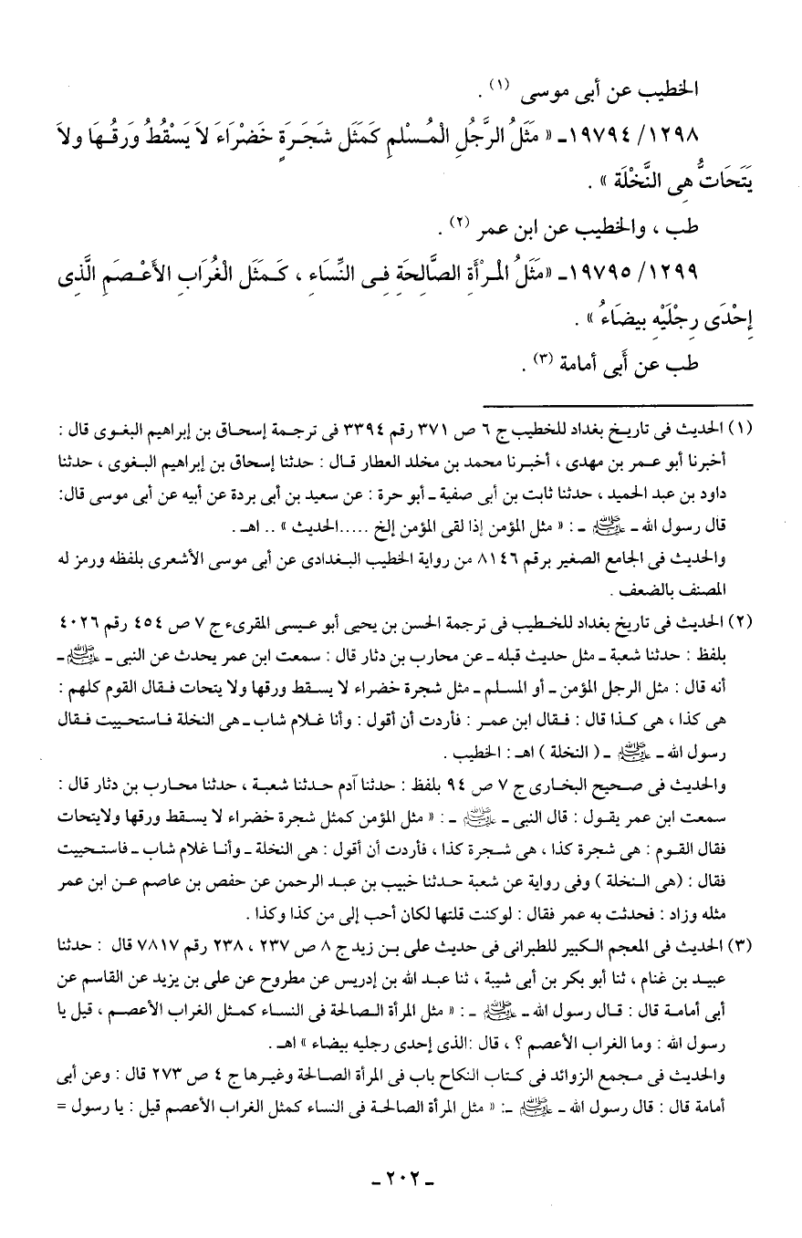 1298/ 19794 - "مَثَلُ الرَّجُلِ الْمُسْلمِ مَثَل شَجَرَةٍ خَضْرَاءَ لَا يَسْقُطُ وَرقُهَا ولَا يَتَحَاتُّ هِي النَّخْلَة".