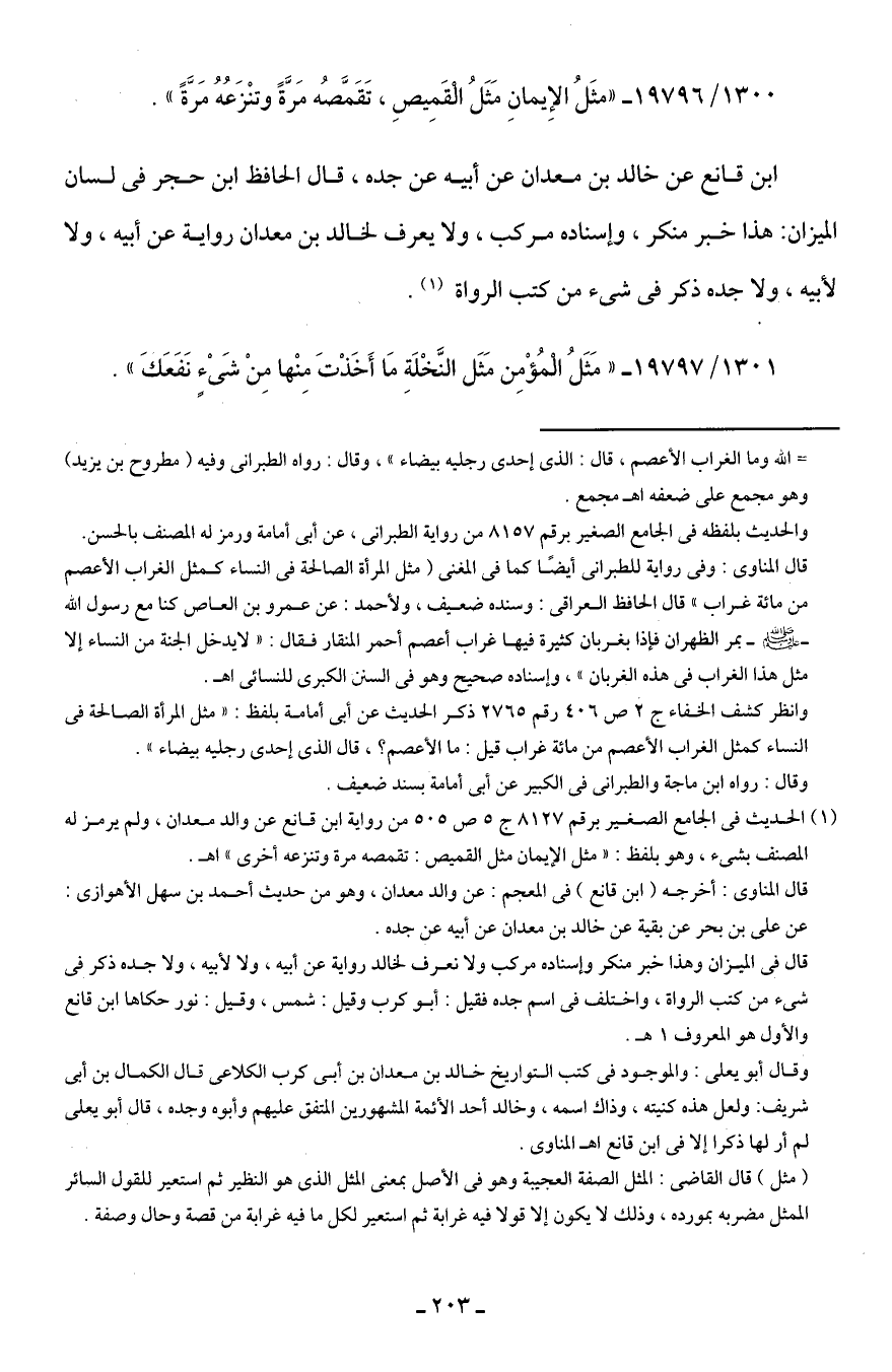 1300/ 19796 - "مثَلُ الإِيمانِ مَثَلُ الْقَمِيصِ، تَقَمَّصُه مَرَّةً وتنْزَعُهُ مَرَةً".