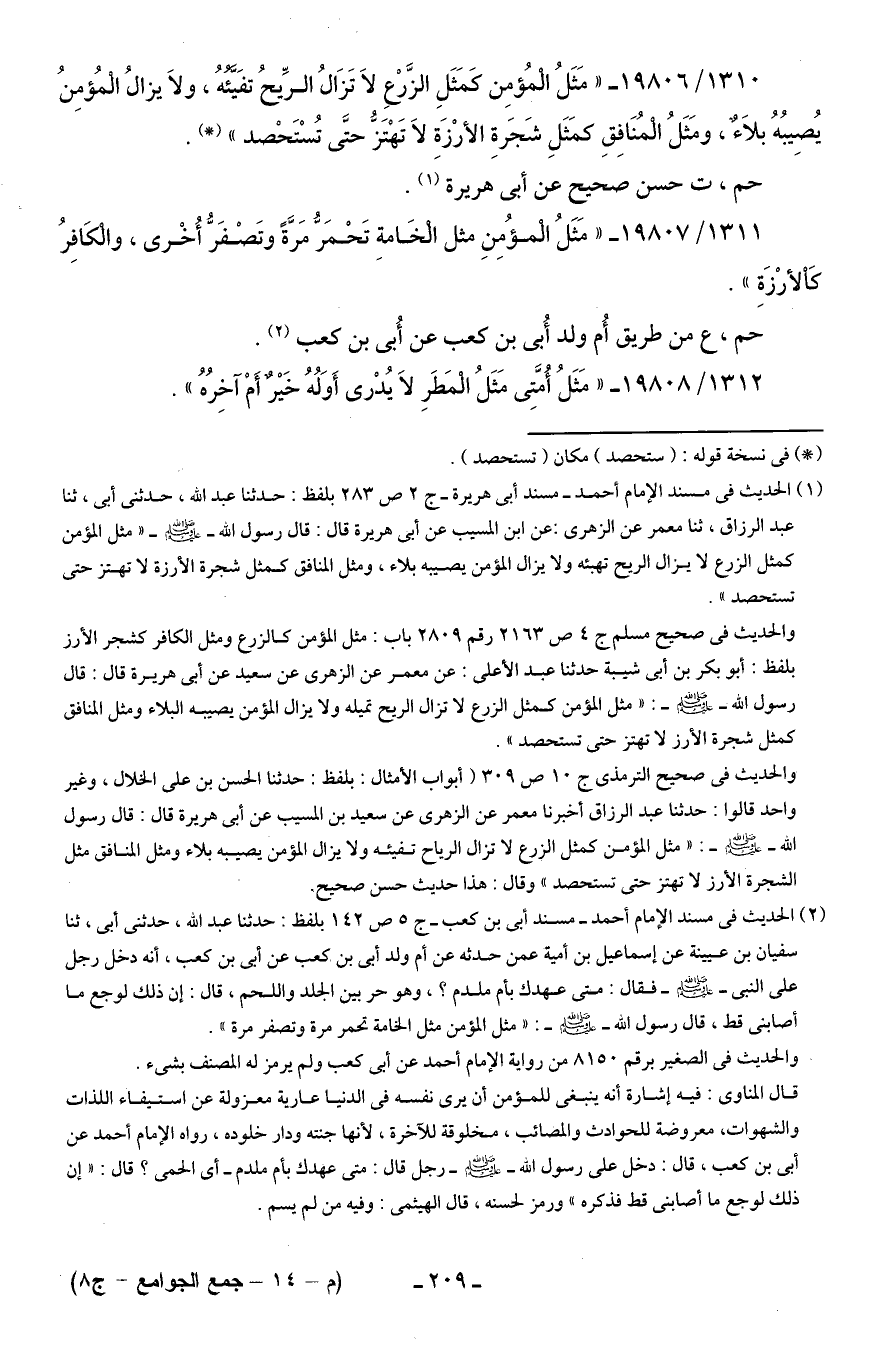1310/ 19806 - "مَثَلُ الْمُؤمِن كَمَثَلِ الزَّرْعِ لَا تَزَالُ الرِّيحُ تفَيّئُهُ، ولَا يزالُ الْمُؤمِنُ يُصِيبُهُ بلَاء، ومَثَلُ الْمُنَافِقِ كمَثَلِ شَجَرةِ الأرْزَةِ لَا تَهْتَزُّ حتَّى تُسْتَحْصد" (*).