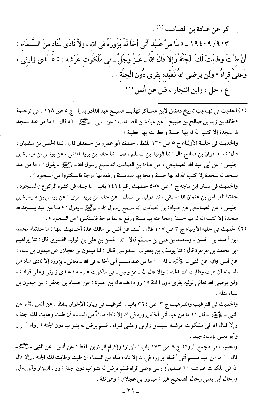 913/ 19409 - "مَا مِنْ عَبْدٍ أَتَي أَخًا لَهُ يَزُورُهُ في اللهِ، إلَّا نَادَي مُنَادٍ مِنَ السَّمَاءِ: أَنْ طِبْتَ وطابَتْ لَكَ الْجَنَّةُ وَإِلا قَال اللهُ -عَزَّ وَجَلَّ- فِي مَلَكُوتِ عَرْشِه: "عَبْدي زارنِي، وَعَليَّ قِراهُ" وَلنْ يَرْضي اللهُ لَعَبْدِهِ بِقري دُونَ الْجنَّةِ".