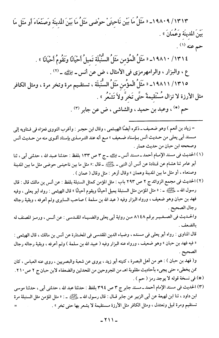 (¬2) الحديث في مجمع الزوائد ج 2 ص 293 باب: مثل المؤمن كمثل السنبلة بلفظ: عن أنس بن مالك قال: قال رسول الله - صلى الله عليه وسلم -: "مثل المؤمن مثل السنبلة يميل أحيانًا ويقوم أحيانًا" قال الهيثمي: رواه أبو يعلى، وفيه فهد بن حبان وهو ضعيف، ورواه البزار وفيه (عبد الله بن سلمة) صاحب السايري ولم أعرفه، وبقية رجاله رجال الصحيح.