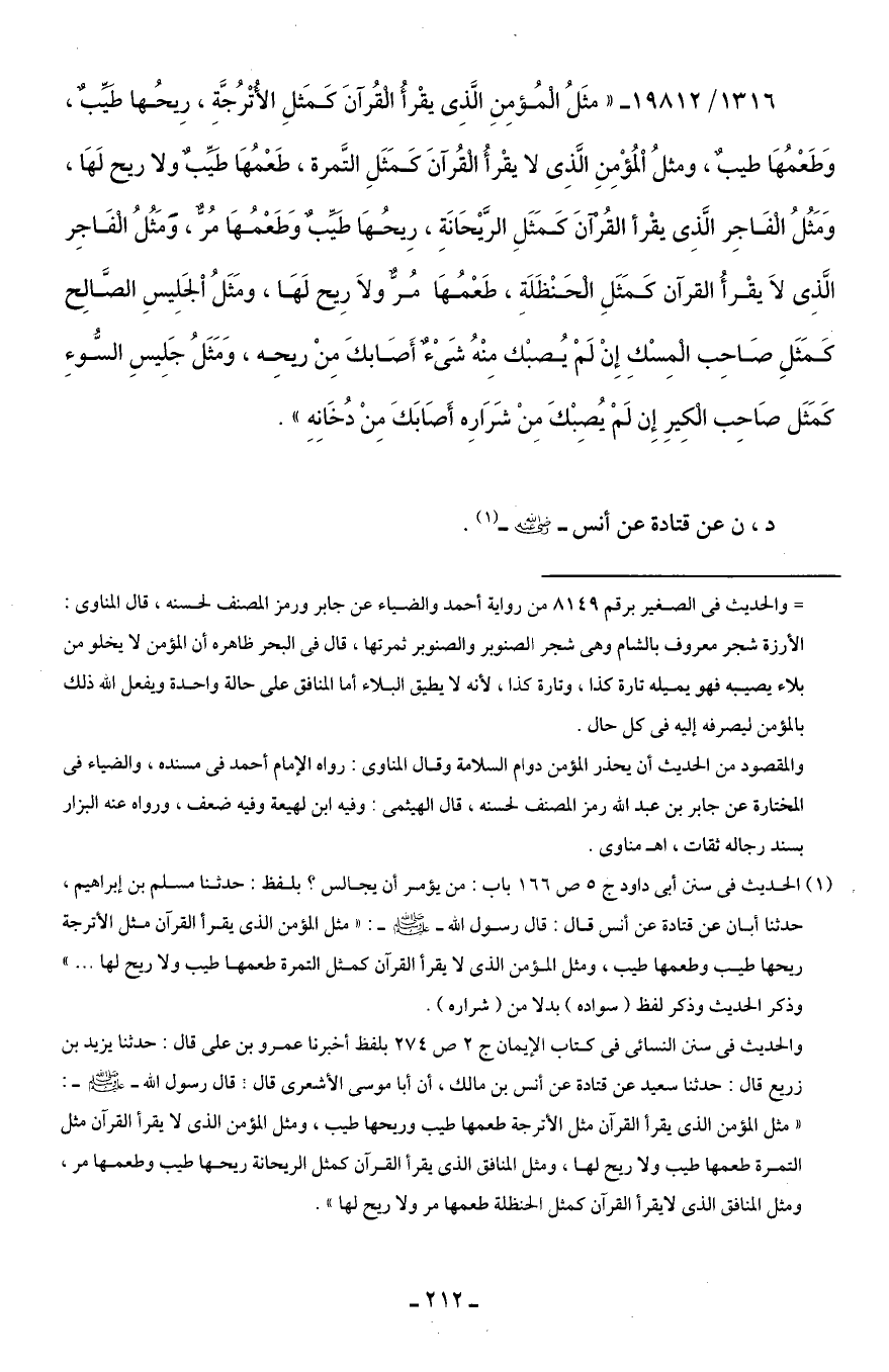 1316/ 19812 - "مثَلُ الْمُؤمِنِ الَّذِي يقْرأُ الْقُرآنَ كَمَثلِ الأُتْرُجَّةِ، رِيحُها طَيِّبٌ، وَطَعْمُهَا طيبٌ، ومثلُ المُؤْمِنِ الَّذِي لا يقْرأُ الْقُرآنَ كَمَثَلِ التَّمرة، طَعْمُهَا طَيِّبٌ ولا ريح لَهَا، وَمَثَلُ الْفَاجِر الَّذِي يقْرأ القُرآنَ كَمَثَلِ الرَّيحَانَةِ، رِيحُهَا طَيِّبٌ وَطَعْمُهَا مُرٌّ، وَمَثُلُ الْفَاجِر الَّذِي لَا يقْرأُ القرآن كمَثَلِ الْحَنْظَلَةِ، طَعْمُهَا مُرّ ولَا رِيح لَهَا، ومَثَلُ الْجَلِيسِ الصَّالِح كَمَثَلِ صَاحِب الْمِسْكِ إِنْ لَمْ يُصبْك مِنْهُ شَيءٌ أَصَابكَ مِنْ ريحِه، وَمَثَلُ جَلِيسِ السُّوءِ كَمَثَل صَاحِب الْكِيرِ إِنَّ لَمْ يُصِبْكَ مِنْ شَرَارِه أَصَابَكَ مِنْ دُخَانِهِ".