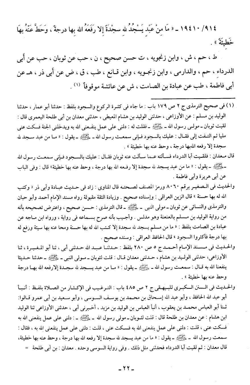914/ 1940 - "مَا مِنْ عَبْدٍ يَسْجُدُ للهِ سجْدَةً إِلا رَفَعَهُ الله بِها درجةً، وَحَطَّ عَنْهُ بهَا خَطِيئَةً".