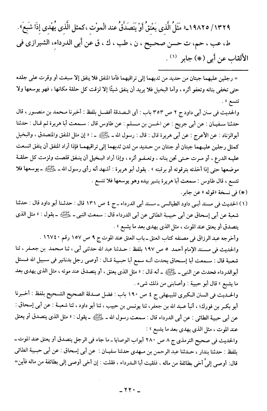 (¬1) الحديث في مسند أبي داود الطيالسى- مسند أبي الدرداء - ج 4 ص 131 قال: حدثنا أبو داود قال: حدثنا شعبة عن أبي إسحاق عن أبي حبيبة الطائى عن أبي الدرداء قال: سمعت النبي - صلى الله عليه وسلم - يقول: "مثل الذي يتصدق أو يعتق عند الموت، مثل الذي يهدى بعد ما يشبع".
