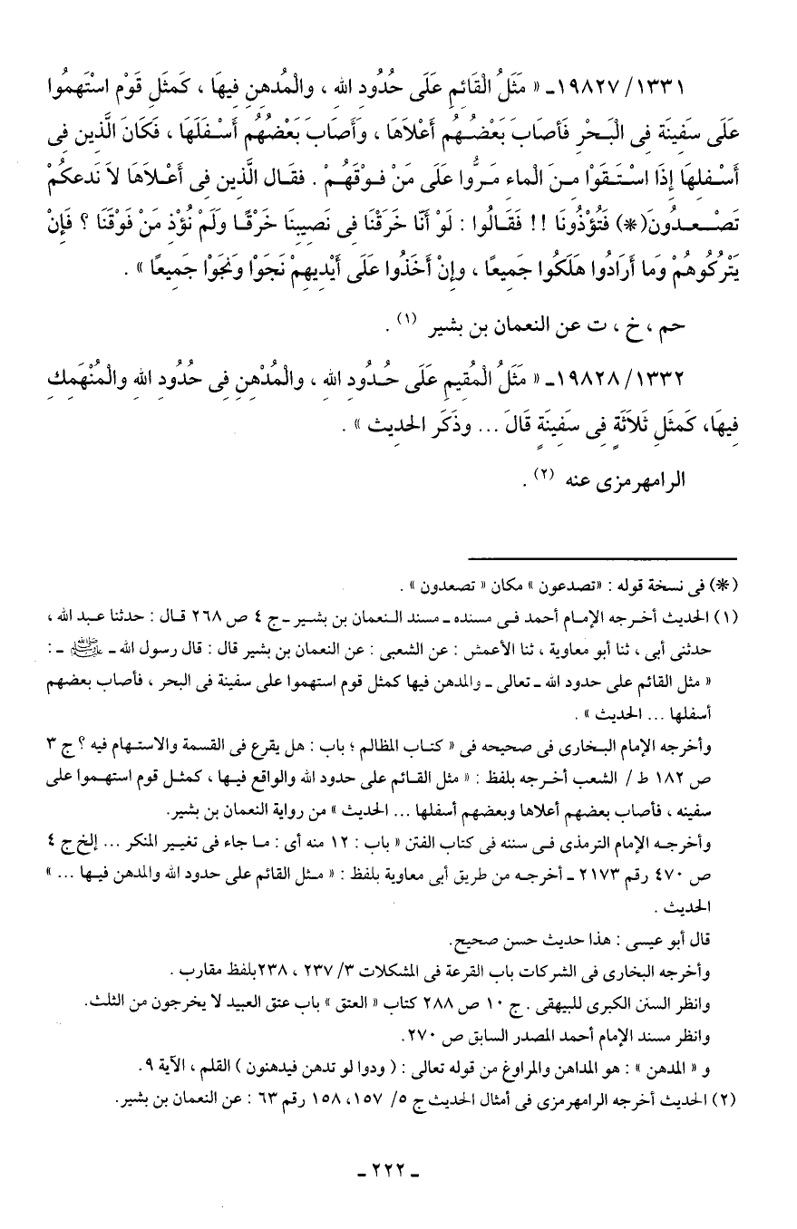 (¬1) الحديث أخرجه الإمام أحمد في مسنده -مسند النعمان بن بشير- ج 4 ص 268 قال: حدثنا عبد الله، حدثني أبي، ثنا أبو معاوية، ثنا الأعمش: عن الشعبي. عن النعمان بن بشير قال: قال رسول الله - صلى الله عليه وسلم -: "مثل القائم على حدود الله -تعالى- والمدهن فيها كمثل قوم استهموا على سفينة في البحر، فأصاب بعضهم أسفلها ... الحديث".