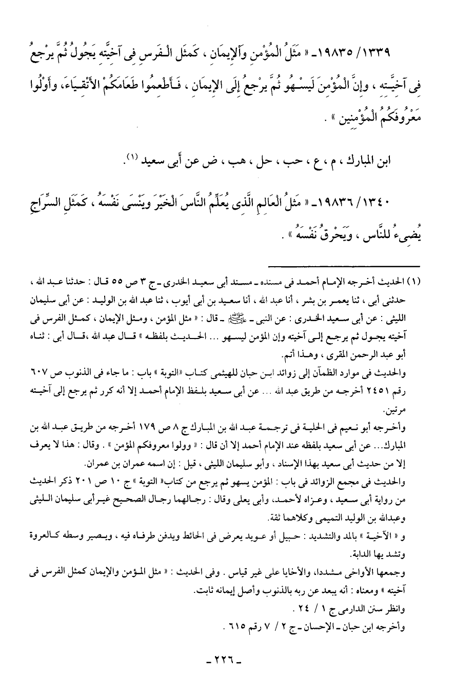 (¬1) الحديث أخرجه الإمام أحمد في مسنده - مسند أبي سعيد الخدري- ج 3 ص 55 قال: حدثنا عبد الله، حدثني أبي، ثنا يعمر بن بشر، أنا عبد الله، أنا سعيد بن أبي أيوب، ثنا عبد الله بن الوليد: عن أبي سليمان الليثي: عن أبي سعيد الخدري: عن النبي - صلى الله عليه وسلم - قال: "مثل المؤمن، ومثل الإيمان، كمثل الفرس في آخيته يجول ثم يرجع إلى آخيته وإن المؤمن ليسهو ... الحديث بلفظه" قال عبد الله، قال أبي: ثناه أبو عبد الرحمن المقرى، وهذا أتم.