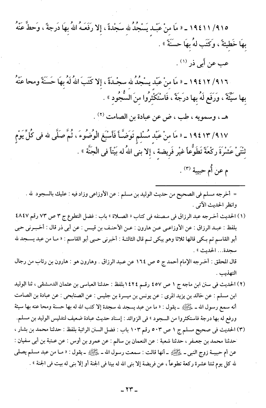 915/ 19411 - "مَا مِنْ عَبْدٍ يَسْجُدُ للهِ سَجْدةً، إِلا رَفَعَهُ اللهُ بِهَا دَرجةً، وَحطَّ عَنْهُ بِهَا خَطِيئةً، وَكَتَب لهُ بِهَا حسَنَةً".