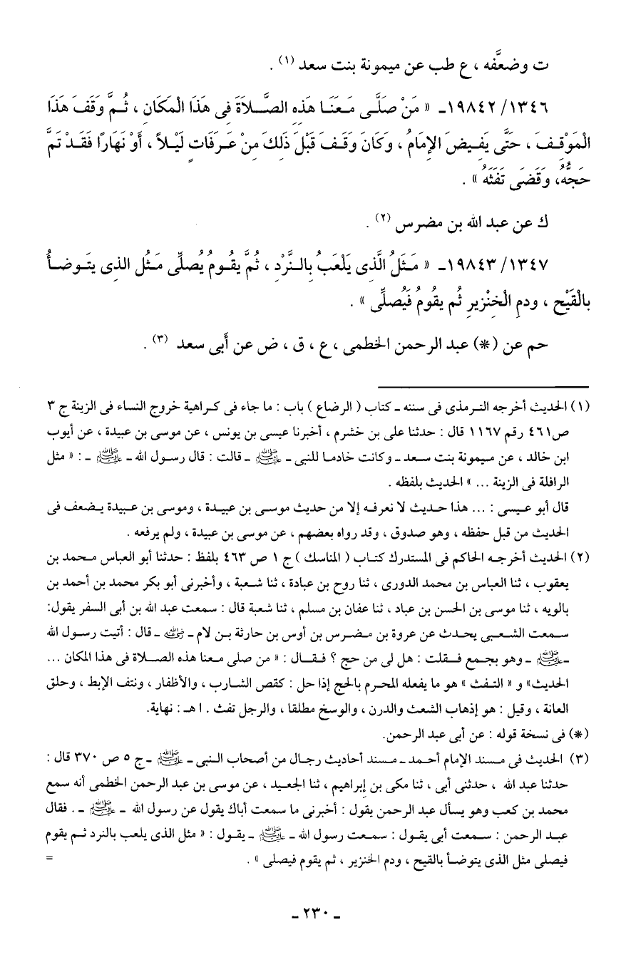1346/ 19842 - "مَنْ صَلَّى مَعَنَا هَذِهِ الصَّلاةَ فِي هَذَا الْمَكَانِ، ثُمَّ وَقَفَ هَذَا الْمَوْقِفَ، حَتَّى يَفِيضَ الإِمَامُ، وَكَانَ وَقَفَ قَبْلَ ذَلِكَ مِنْ عَرَفَاتٍ لَيلًا، أَوْ نَهَارًا فَقَدْ تَمَّ حَجُّهُ، وَقَضَى تَفَثَهُ".