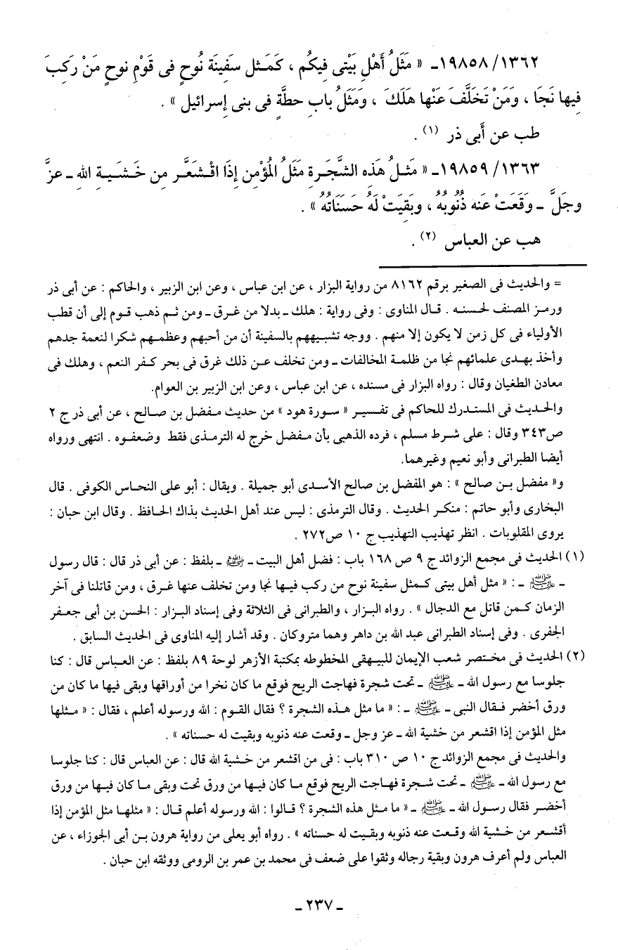 1362/ 19858 - "مَثَلُ أَهْلِ بَيتى فِيكُم، كمَثل سَفِينَة نُوحٍ في قَوْمِ نوحٍ مَنْ رَكِبَ فِيها نَجَا، وَمَنْ تَخَلَّفَ عَنْها هَلَكَ، وَمَثَلُ بابِ حطَّةٍ في بني إِسرائيل".