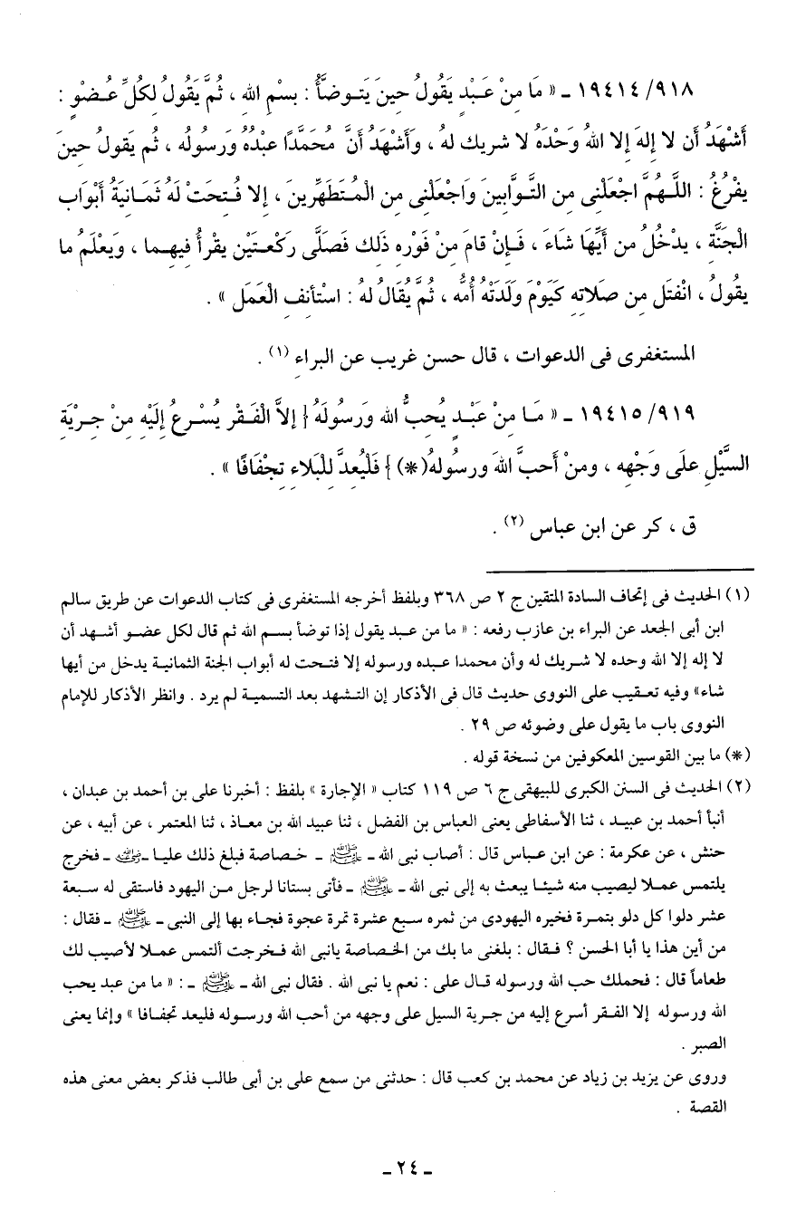 919/ 19415 - "مَا مِنْ عَبْدٍ يُحِبُّ الله وَرسُولَهُ [إلَّا الْفَقْر يُسْرعُ إِلَيهِ مِنْ جِرْيَةِ السَّيلِ علَي وَجْهِه، ومنْ أَحبَّ اللهَ ورسُولهُ (*)] فَلْيُعِدَّ لِلْبَلاءِ تِجْفَافًا".