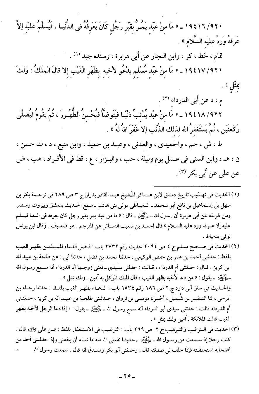 (¬1) الحديث في تهذيب تاريخ دمشق لابن عساكر للشيخ عبد القادر بدران ج 3 ص 289 في ترجمة بكر بن سهل بن إسماعيل بن نافع أبو محمد -الدمياطي مولي بني هاشم- سمع الحديث بدمشق وبيروت ومصر ومن طريقه عن أبي هريرة أن رسول الله - صلى الله عليه وسلم - قال: "ما من عبد يمر بقبر رجل كان يعرفه في الدنيا فيسلم عليه إلا عرفه ورد - عليه السلام - "قال أحمد بن شعيب النسائي عن المترجم: هو ضعيف. وقال ابن يونس توفي بدمياط.