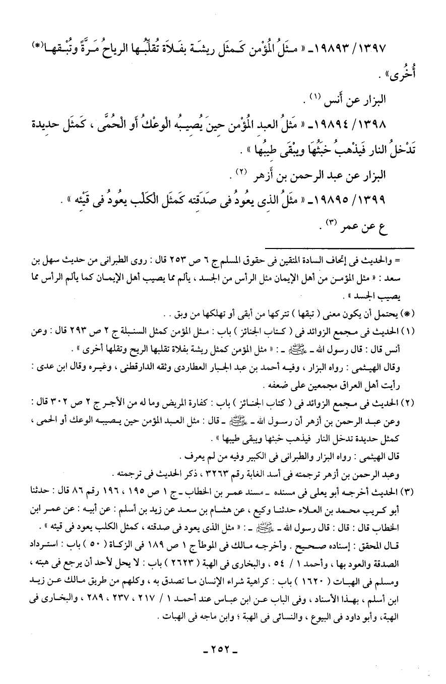 (¬1) الحديث في مجمع الزوائد في (كتاب الجنائز) باب: مثل المؤمن كمثل السنبلة ج 2 ص 293 قال: وعن أَنس قال: قال رسول الله - صلى الله عليه وسلم -: "مثل المؤمن كمثل ريشة بفلاة تقلبها الريح وتقلها أخرى".