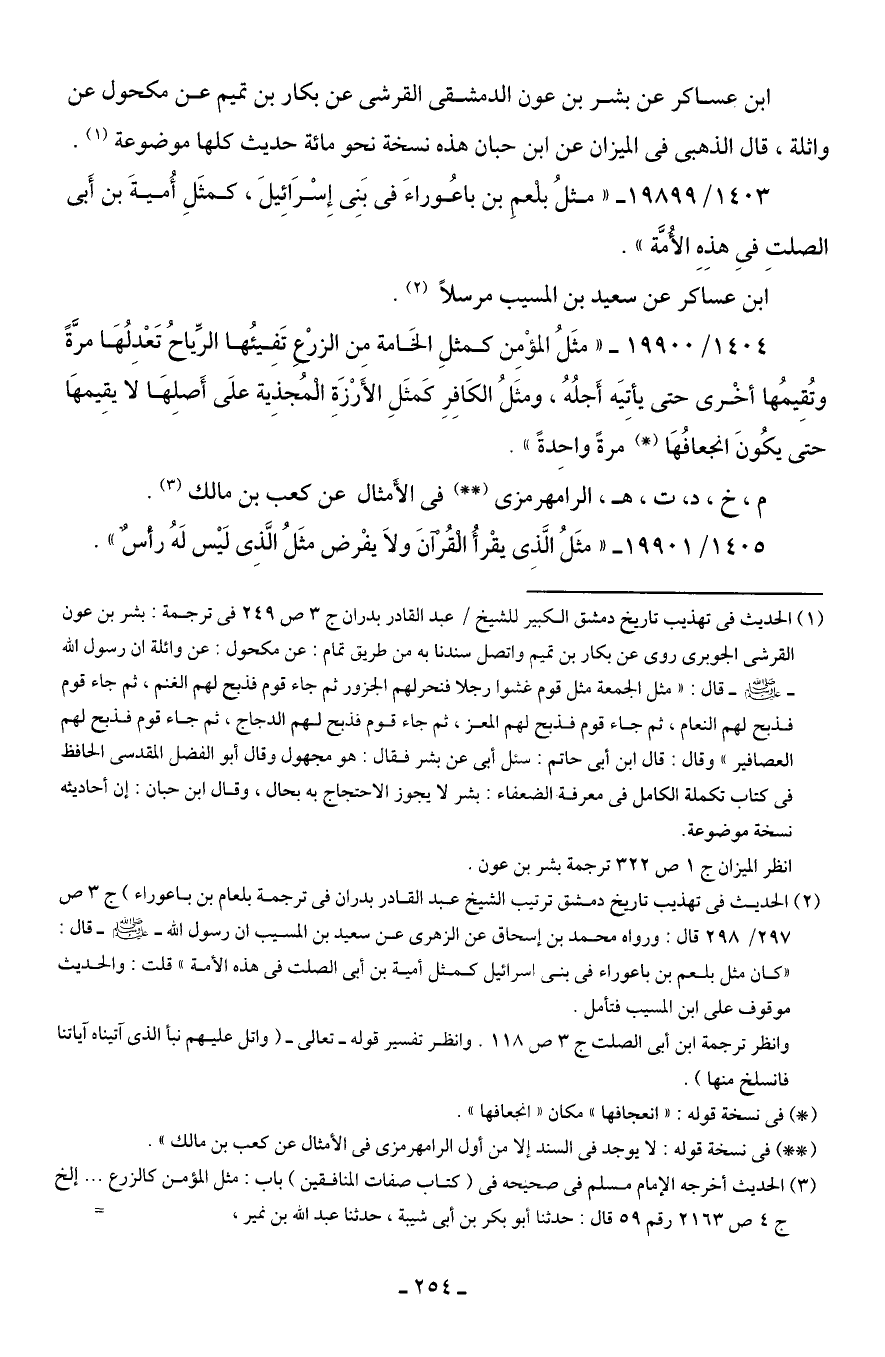 1403/ 19899 - "مثلُ بلْعمِ بن باعُوراءَ في بَنِي إِسْرَائِيلَ، كمثَلِ أُميةَ بن أَبي الصلتِ في هذِهِ الأُمَّة".