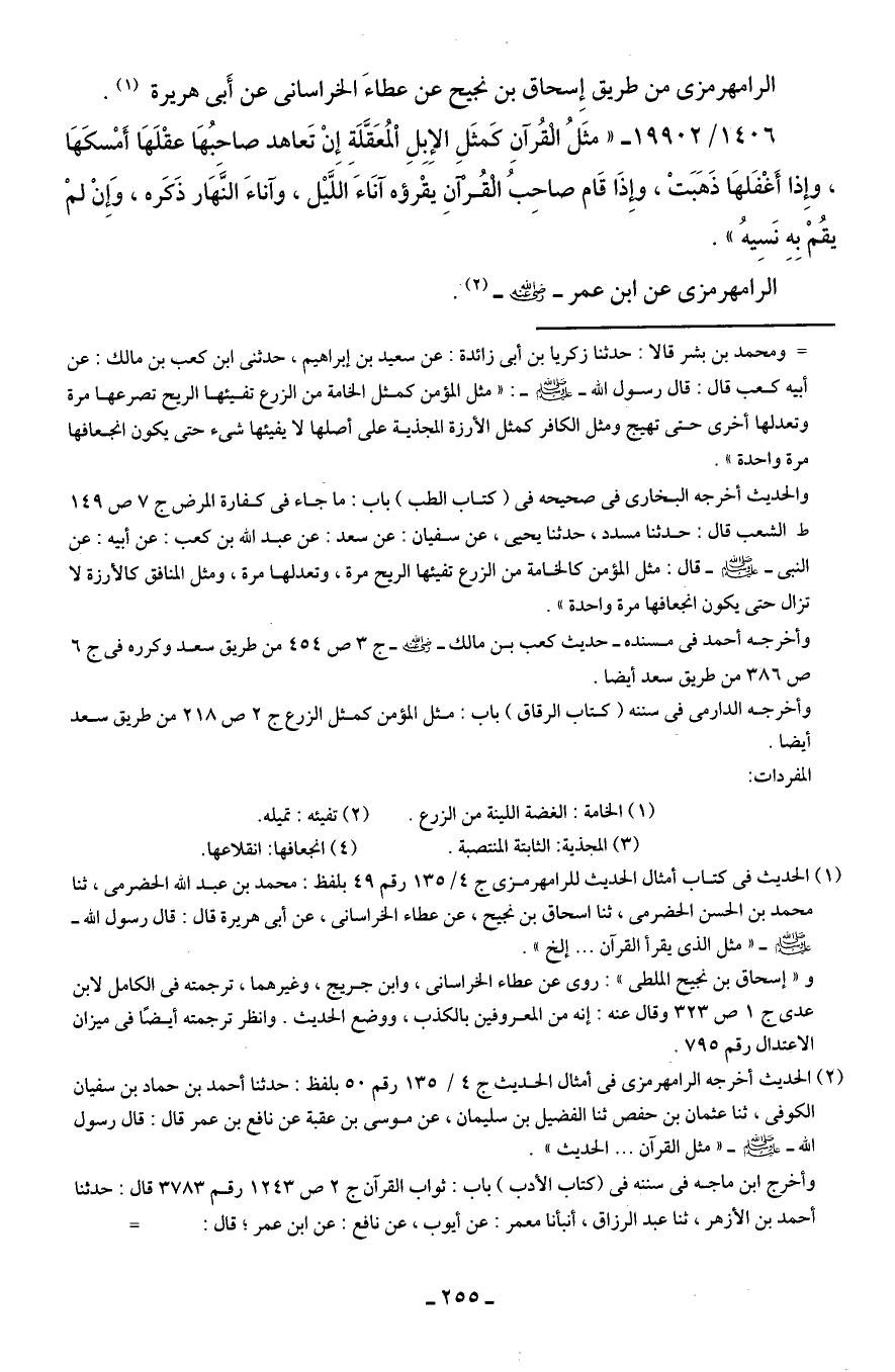(¬2) الحديث أخرجه الرامهرمزى في أمثال الحديث ج 4/ 135 رقم 50 بلفظ: حدثنا أحمد بن حماد بن سفيان الكوفي، ثنا عثمان بن حفص ثنا الفضيل بن سليمان، عن موسى بن عقبة عن نافع بن عمر قال: قال رسول الله - صلى الله عليه وسلم - "مثل القرآن ... الحديث".