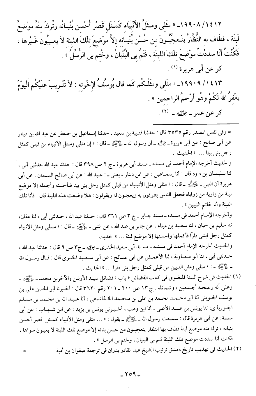 1412/ 19908 - "مثَلِى ومثَلُ الأنْبِيَاءِ كَمَثَلِ قَصْر أُحْسِن بُنْيانُه وتُركَ مِنْهُ موْضعُ لَبِنَة، فطَاف بهِ النُّظَّارُ يتَعجَّبُونَ مِن حُسْن بُنْيانه إلا موْضِعَ تِلكَ اللبِنةِ لَا يعِيبُون غَيرها، فَكُنْتُ أَنَا سددْتُ موْضِعَ تِلكَ اللبِنَةِ، فَتَمَّ بِى الْبُنْيانُ، وخُتِم بى الرُّسُلُ".