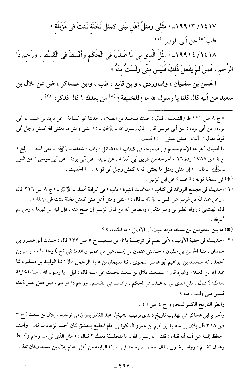 (¬2) الحديث في حلية الأولياء لأبي نعيم في ترجمة بلال بن سعيد ج 5 ص 233 قال: حدثنا أبو عمرو بن حمدان، ثنا الحسن بن سفيان، حدثني عثمان بن إسماعيل بن عمران الدمشقي (ح) وحدثنا سليمان بن أحمد، ثنا محمد بن إبراهيم أبو عامر النحوي، ثنا سليمان بن عبد الرحمن قالا: ثنا الوليد بن مسلم، ثنا عبد الله بن العلاء وغيره قال: سمعت بلال بن سعيد يحدث عن أبيه قال: قيل: يا رسول الله، ما للخليفة بعدك؛ ؟ قال. مثل الذي لي ما عدل في الحكم، وأقسط في القسم، ورحم ذا الرحم، فمن فعل غير ذلك فليس منى ولست منه".