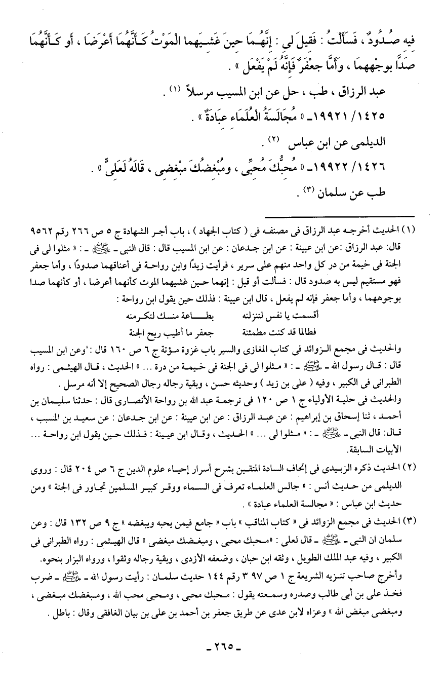 (¬1) الحديث أخرجه عبد الرزاق في مصنفه في (كتاب الجهاد)، باب أجر الشهادة ج 5 ص 266 رقم 9562 قال: عبد الرزاق: عن ابن عيينة: عن ابن جدعان: عن ابن المسيب قال: قال النبي - صلى الله عليه وسلم -: "مثلوا لي في الجنة في خيمة من در كل واحد منهم على سرير، فرأيت زيدًا وابن رواحة في أعناقهما صدودًا، وأما جعفر فهو مستقيم ليس به صدود قال: فسألت أو قيل: إنهما حين غشيهما الموت كأنهما أعرضا، أو كأنهما صدا بوجوههما، وأما جعفر فإنه لم يفعل، قال ابن عيينة: فذلك حين يقول ابن رواحة: