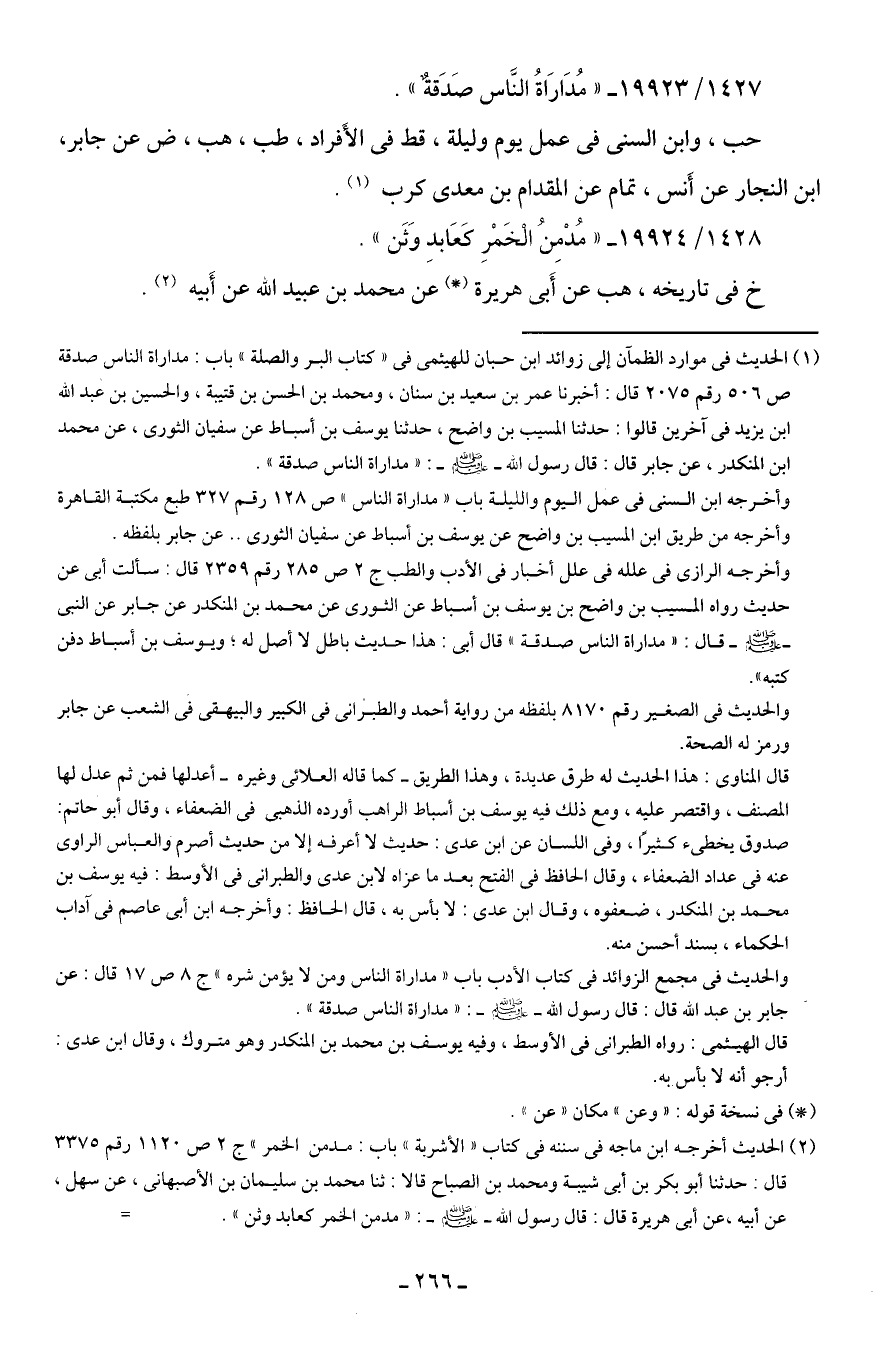 (¬1) الحديث في موارد الظمآن إلى زوائد ابن حبان للهيثمى في "كتاب البر والصلة" باب مداراة الناس صدقة ص 506 رقم 2075 قال: أخبرنا عمر بن سعيد بن سنان، ومحمد بن الحسن بن قتيبة، والحسين بن عبد الله بن يزيد في آخرين قالوا: حدثنا المسيب بن واضح، حدثنا يوسف بن أسباط عن سفيان الثوري، عن محمد بن المنكدر، عن جابر قال: قال رسول الله - صلى الله عليه وسلم -: "مداراة الناس صدقة".