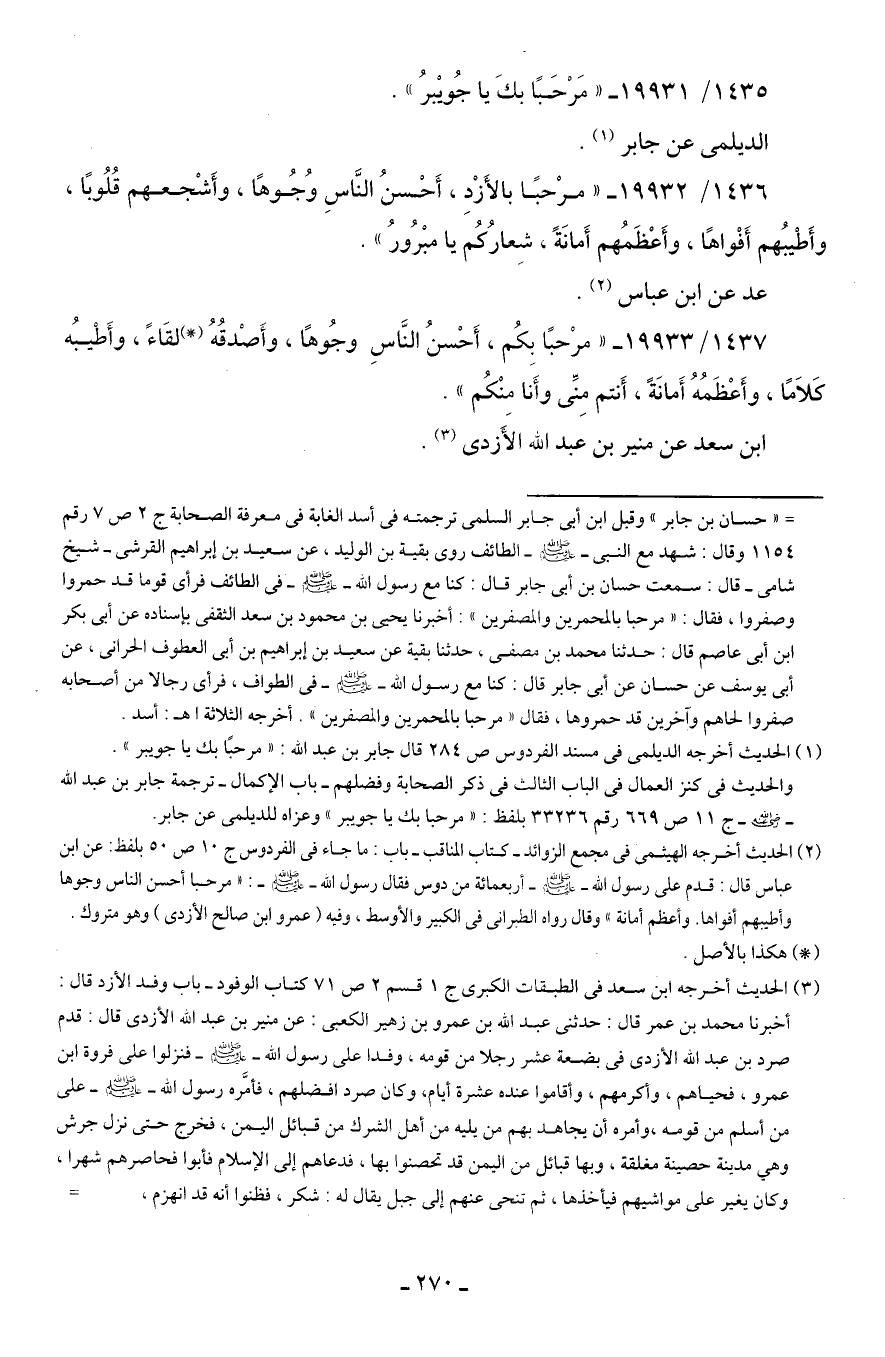1436/ 19932 - "مرْحبًا بالأَزْدِ، أَحْسنُ النَّاسِ وُجُوهًا، وأَشْجعهم قُلُوبًا، وأَطْيبُهم أَفْواهًا، وأَعْظَمُهم أَمانَةً، شِعارُكُم يا مبْرُورُ".