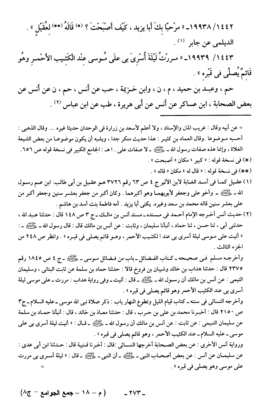 (¬2) حديث أَنس أخرجه الإمام أحمد في مسنده - مسند أَنس بن مالك - ج 3 ص 148 قال: حدثنا عبد الله، حدثني أبي، ثنا حسن، ثنا حماد، أنبأنا سليمان، وثابت: عن أَنس بن مالك قال: قال رسول الله - صلى الله عليه وسلم -: "أتيت على موسى ليلة أسرى بى عند الكثيب الأحمر، وهو قائم يصلى في قبره". وانظر ص 248 من الجزء الثالث.