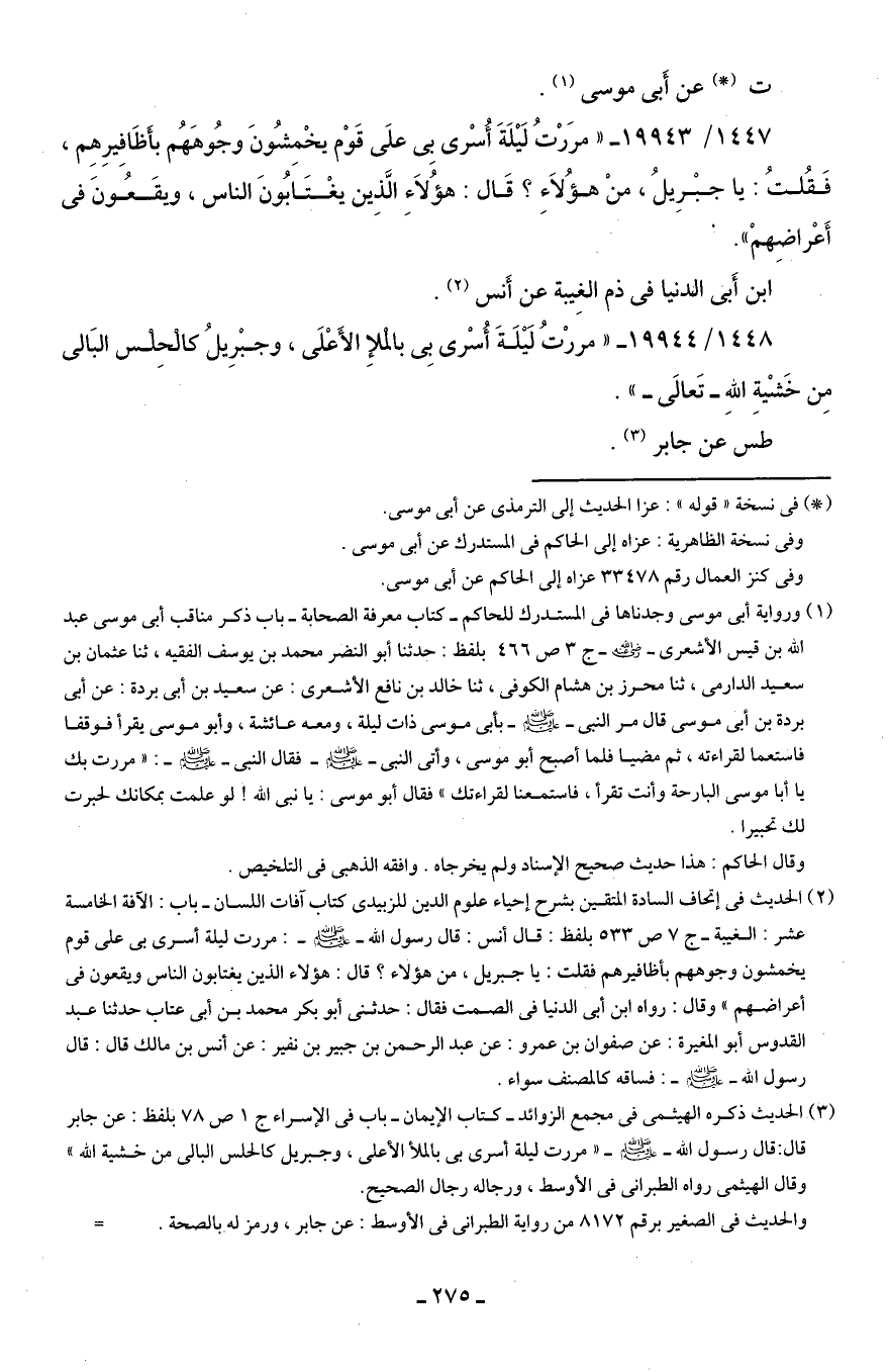 1447/ 19943 - "مرَرْتُ لَيلَةَ أُسْرى بِى علَى قَوْم يخْمِشُونَ وجُوهَهُم بأَظَافِيرِهِم، فَقُلتُ: يا جبْرِيلُ، منْ هؤُلاءِ؟ قَال: هؤُلاءِ الَّذِين يغْتَابُونَ الناس، ويقَعُونَ في أَعْراضِهمْ".