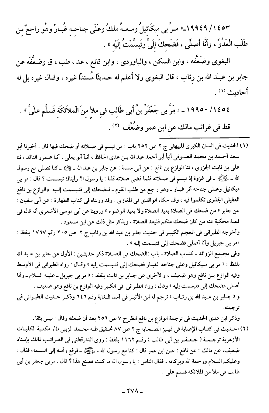 (¬1) الحديث في السنن الكبرى للبيهقى ج 2 ص 252 باب: من تبسم في صلاته أو ضحك فيها قال: أخبرنا أبو سعد أحمد بن محمد الصوفى أنبأ أبو أحمد عبد الله بن عدى الحافظ، أنبأ أبو يعلى، أنبأ عمرو الناقد، ثنا علي بن ثابت الجزرى، ثنا الوازع بن نافع: عن أبي سلمة: عن جابر بن عبد الله - صلى الله عليه وسلم - كنا نصلى مع رسول الله - صلى الله عليه وسلم - في غزوة إذ تبسم في صلاته فلما قضى صلاته قلنا: يا رسول الله - صلى الله عليه وسلم - رأيناك تبسمت؟ قال: مر بى ميكائيل وعلى جناحه أثر غبار - وهو راجع من طلب القوم - فضحك إلى فتبسمت إليه. والوازع بن نافع العقيلي الجذرى تكلموا فيه، وقد حكاه الواقدي في المغازي. وقد رويناه في كتاب الطهارة: عن أبي سفيان: عن جابر "من ضحك في الصلاة يعيد الصلاة ولا يعيد الوضوء" وروينا عن أبي موسى الأشعرى أنه قال في قصة محكية عنه من كان ضحك منكم فليعد الصلاة، ويذكر مثل ذلك عن ابن مسعود.