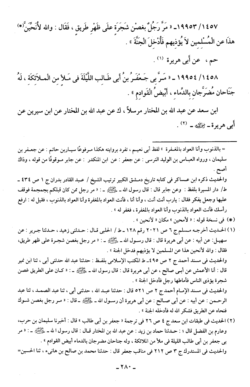 1458/ 19954 - "مَرَّ بِى جَعْفَرُ بن أَبى طَالِب اللَّيلَةَ في مَلأٍ مِن الملائِكَةِ، لَهُ جَنَاحان مُضَرَّجانِ بِالدِّماءِ، أَبْيضُ القَوادِمِ".