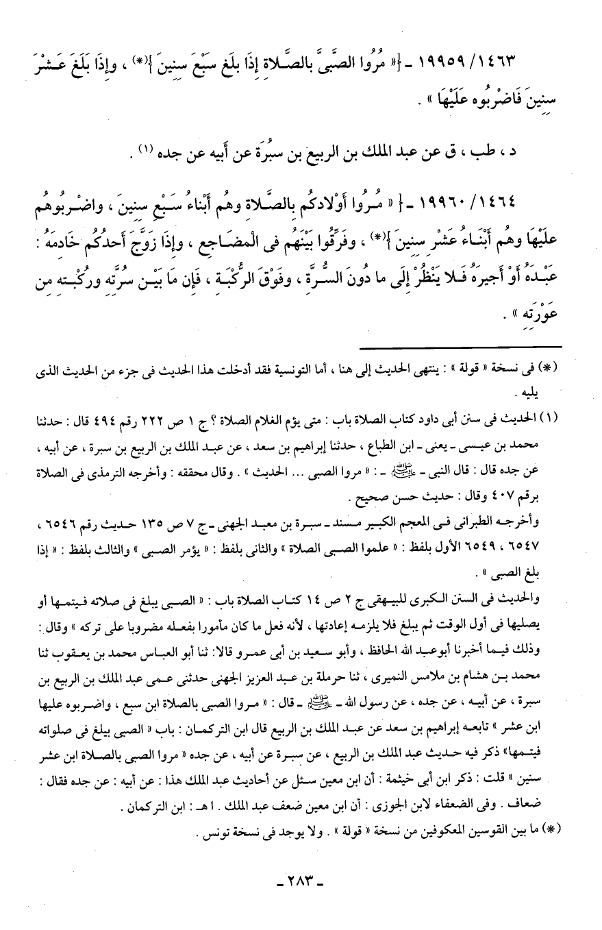 1463/ 19959 - ["مُرُوا الصَّبيَّ بالصَّلاةِ إِذَا بلَغ سَبع سِنِينَ] (*)، وإذَا بَلَغَ عَشْرَ سِنِينَ فَاضْربُوه عَلَيهَا".